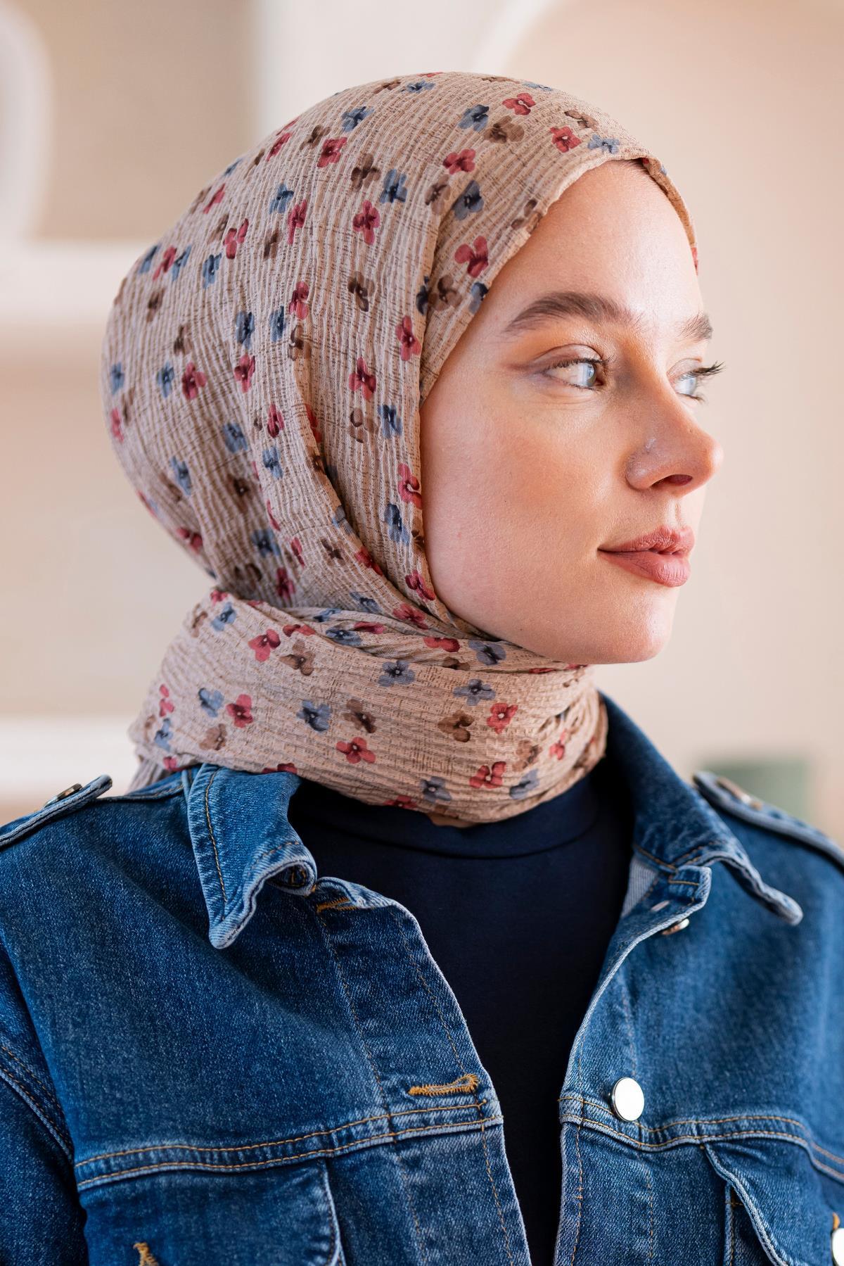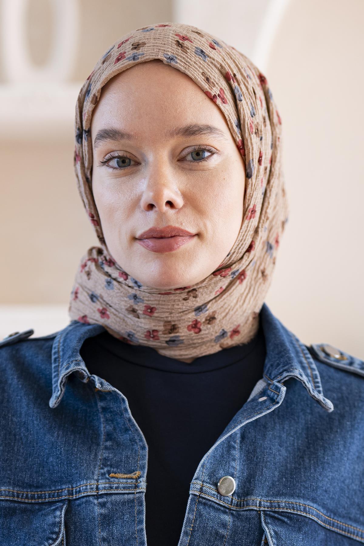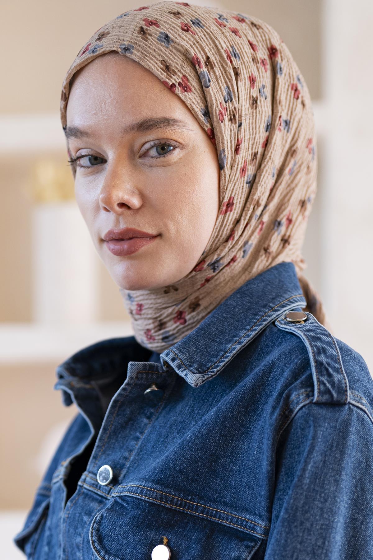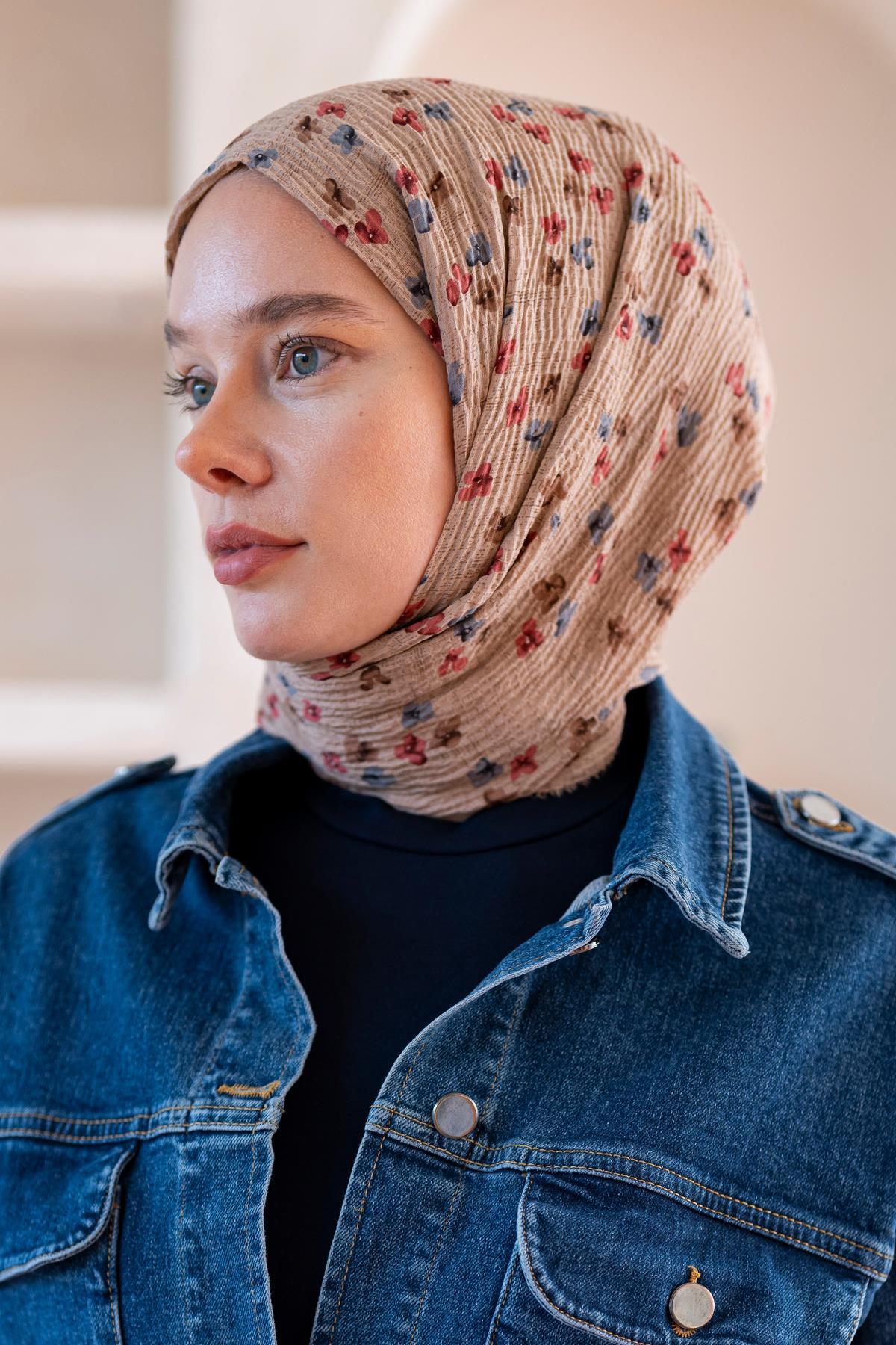 Kadın Çiçek Desenli Kırışmaz Bürümcük Şal 190*80 Cm AÇIK KAHVE