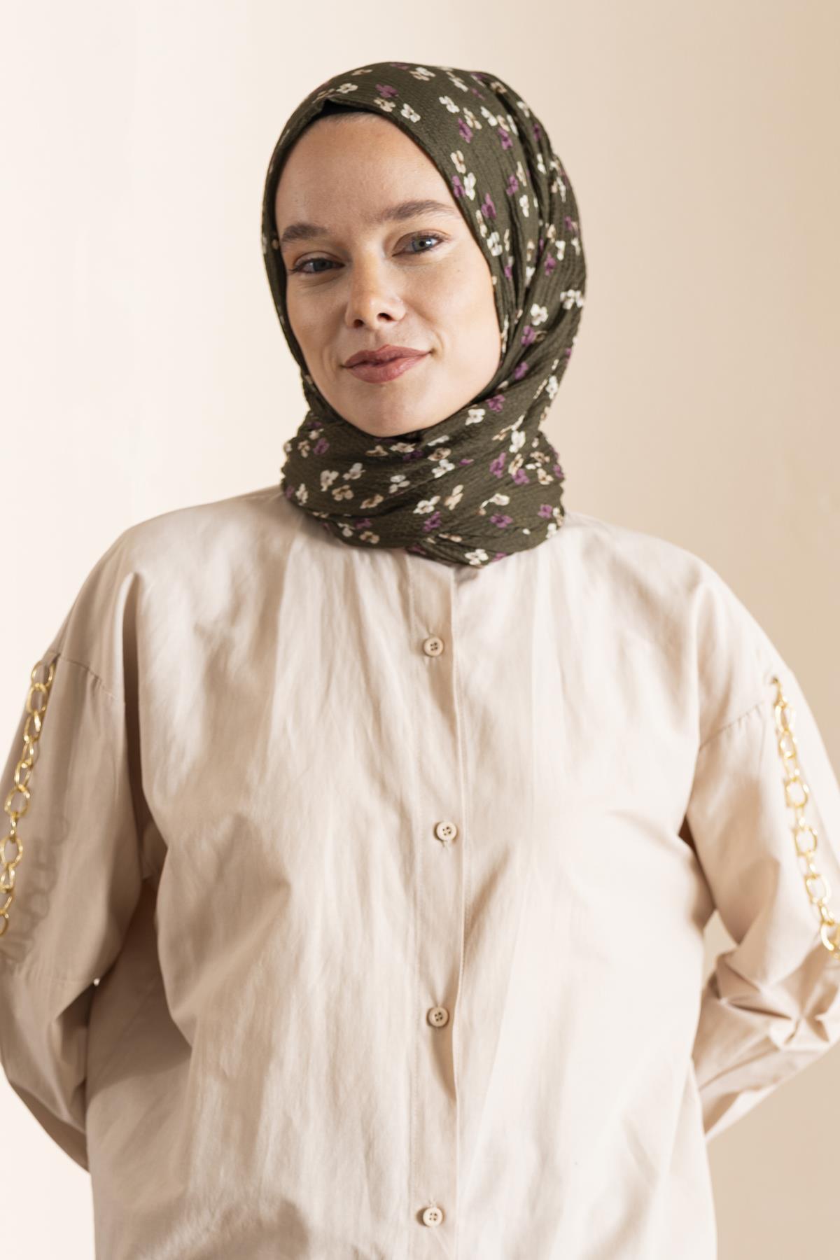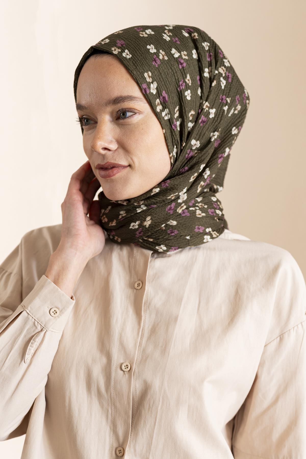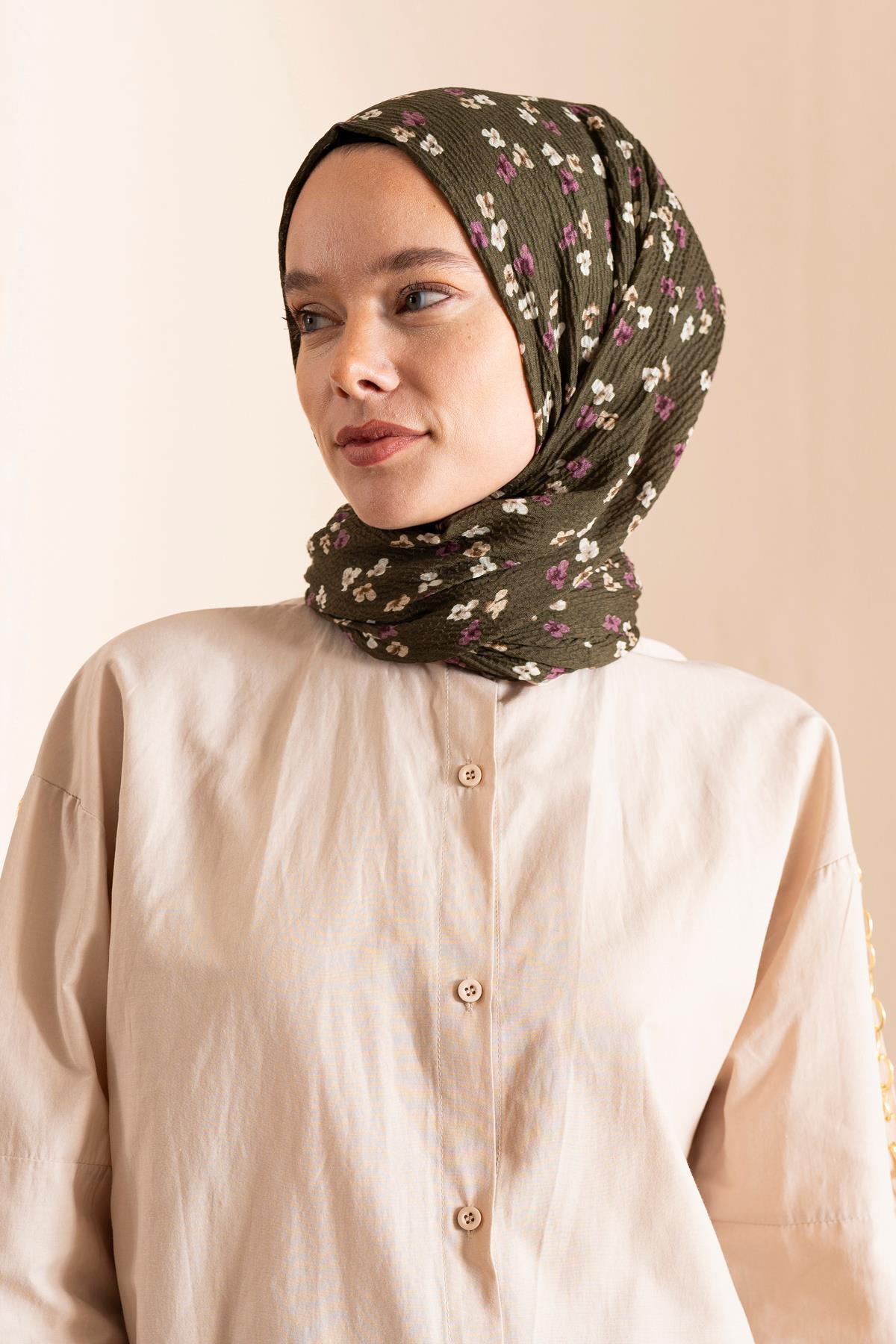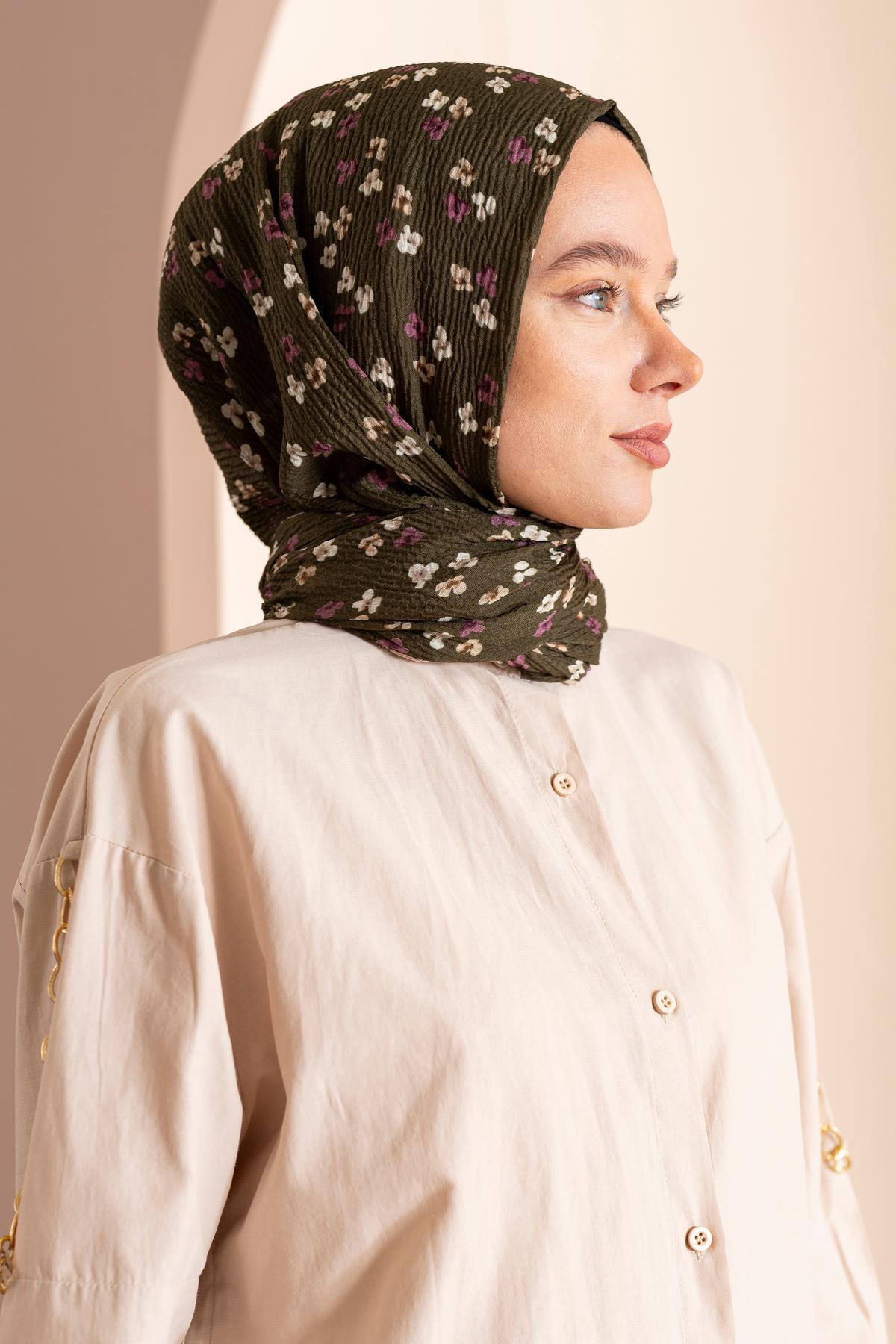 Kadın Çiçek Desenli Kırışmaz Bürümcük Şal 190*80 Cm ASKER YEŞİLİ