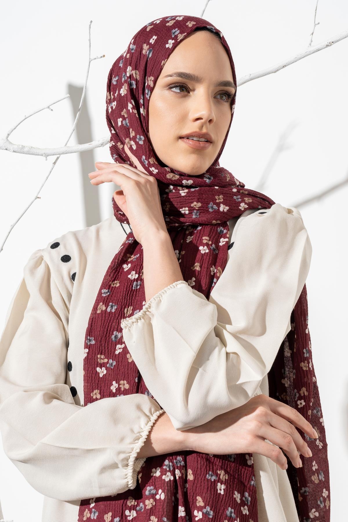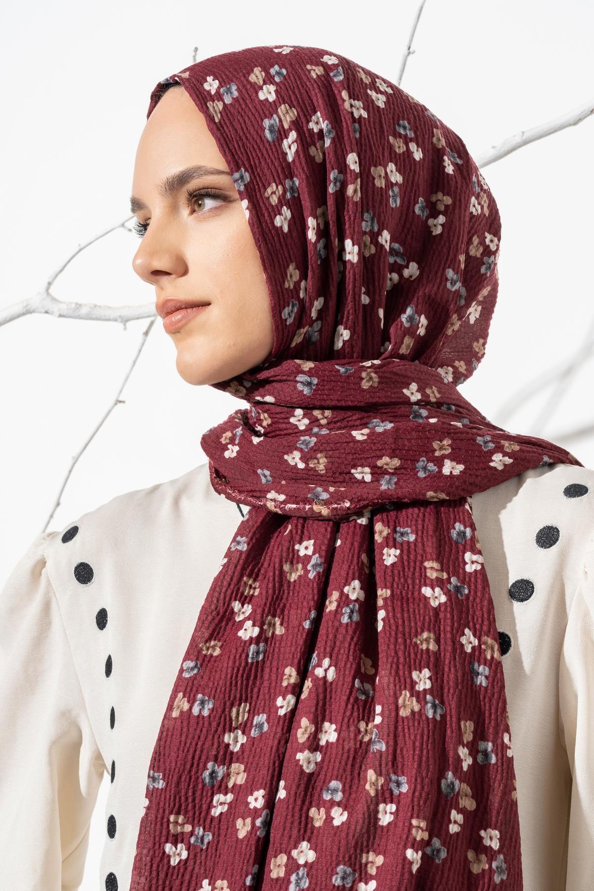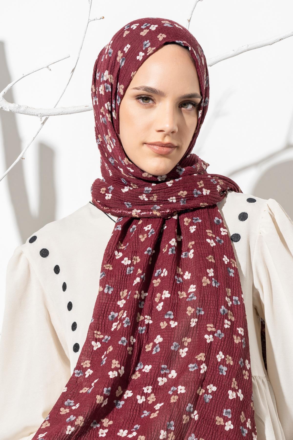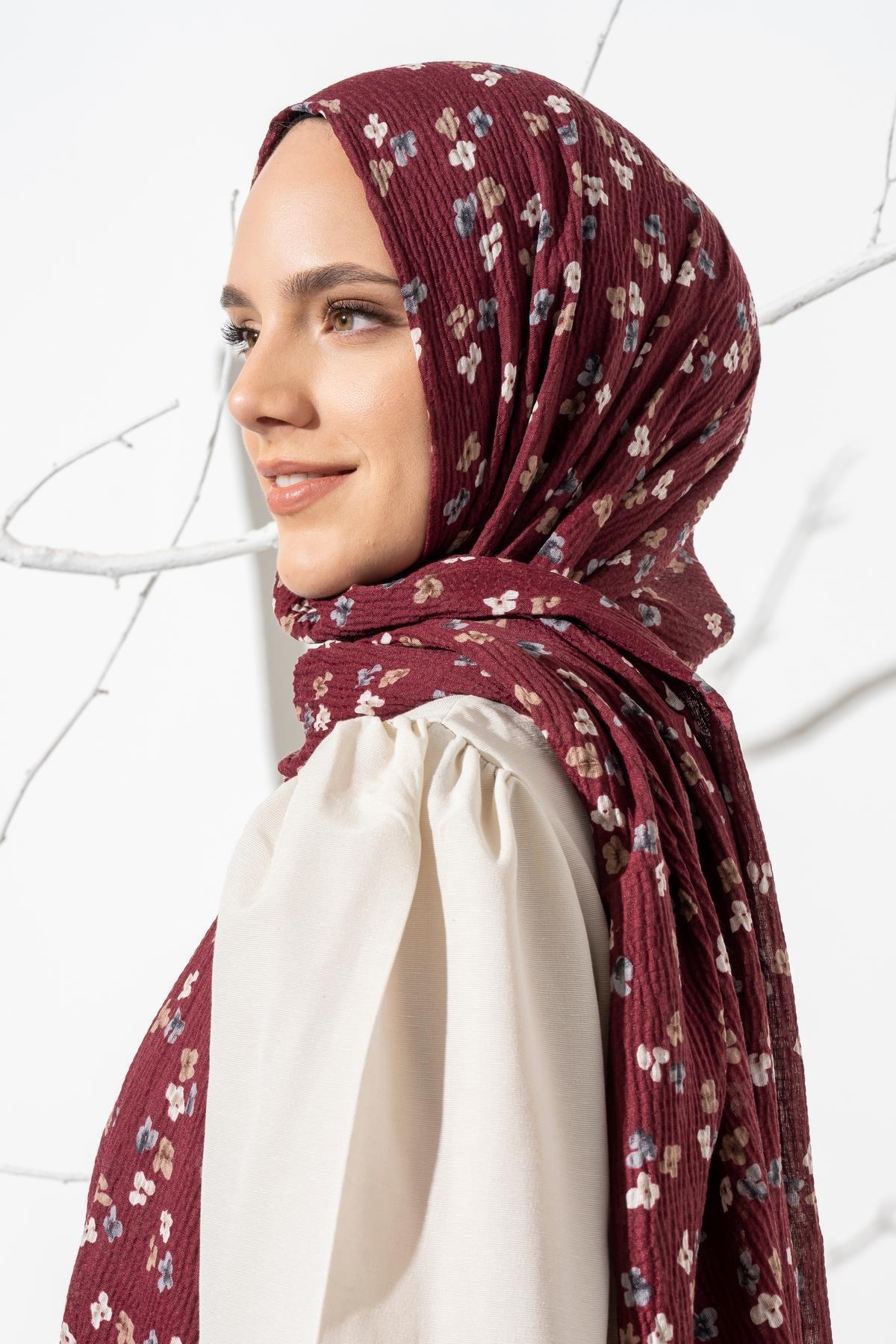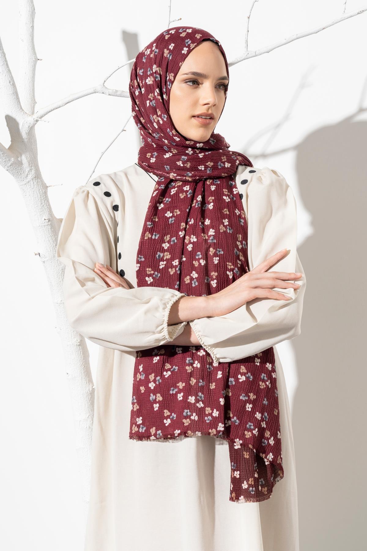 Kadın Çiçek Desenli Kırışmaz Bürümcük Şal 190*80 Cm BORDO