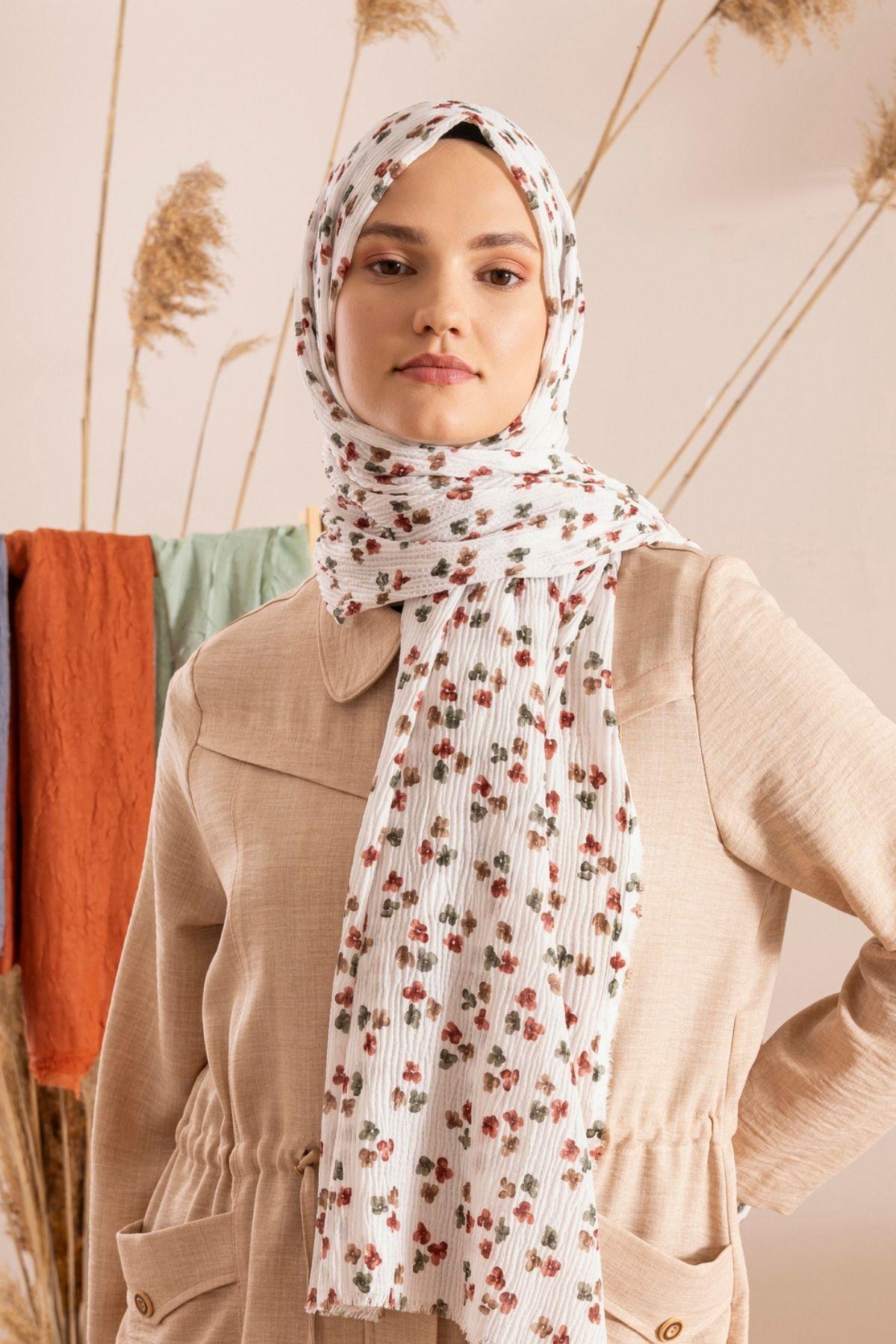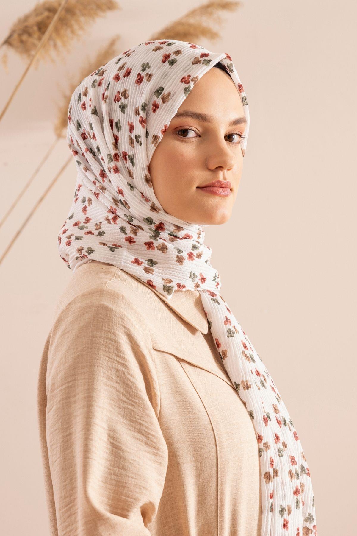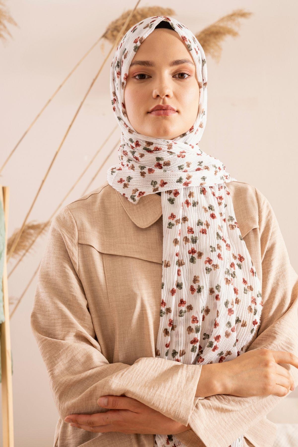 Kadın Çiçek Desenli Kırışmaz Bürümcük Şal 190*80 Cm İNCİ KREM