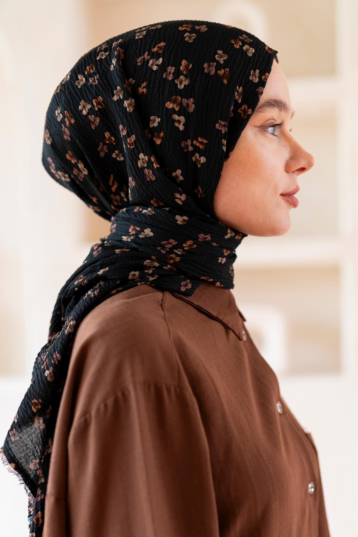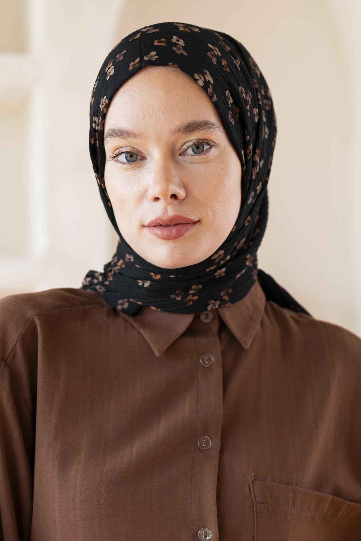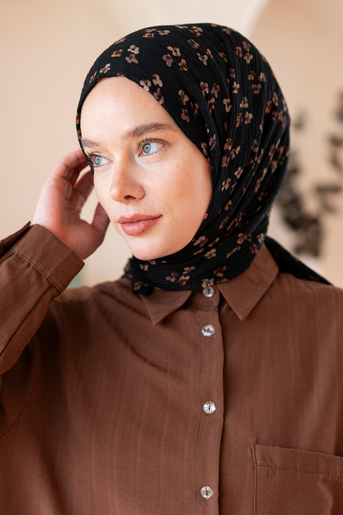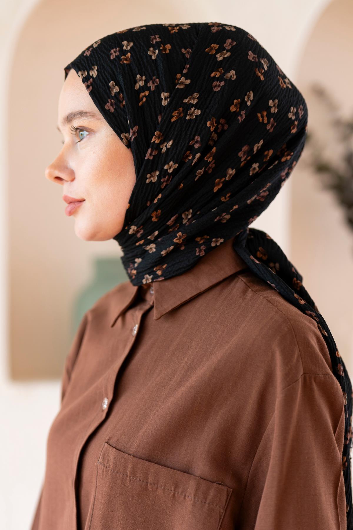 Kadın Çiçek Desenli Kırışmaz Bürümcük Şal 190*80 Cm KOYU CEVİZ