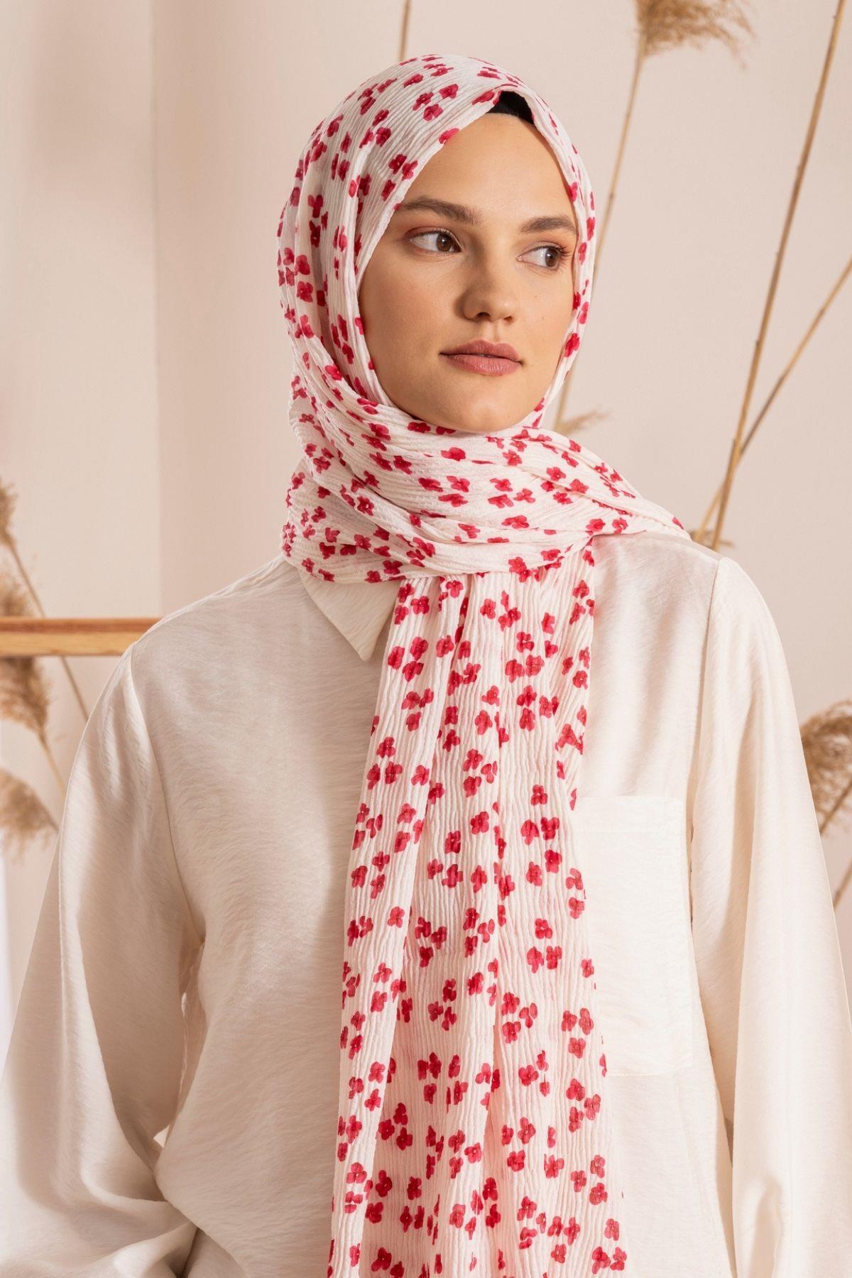 Kadın Çiçek Desenli Kırışmaz Bürümcük Şal 190*80 Cm KREM FUŞYA