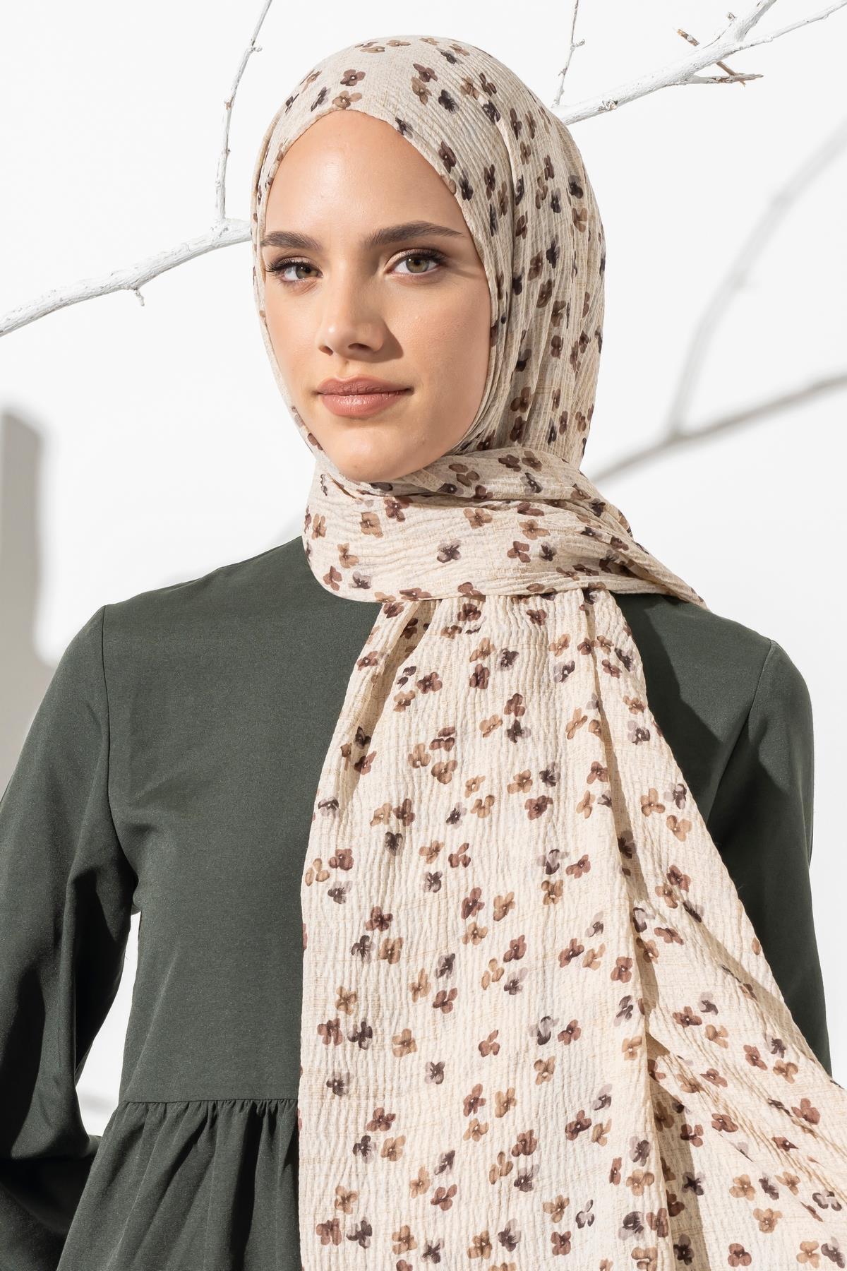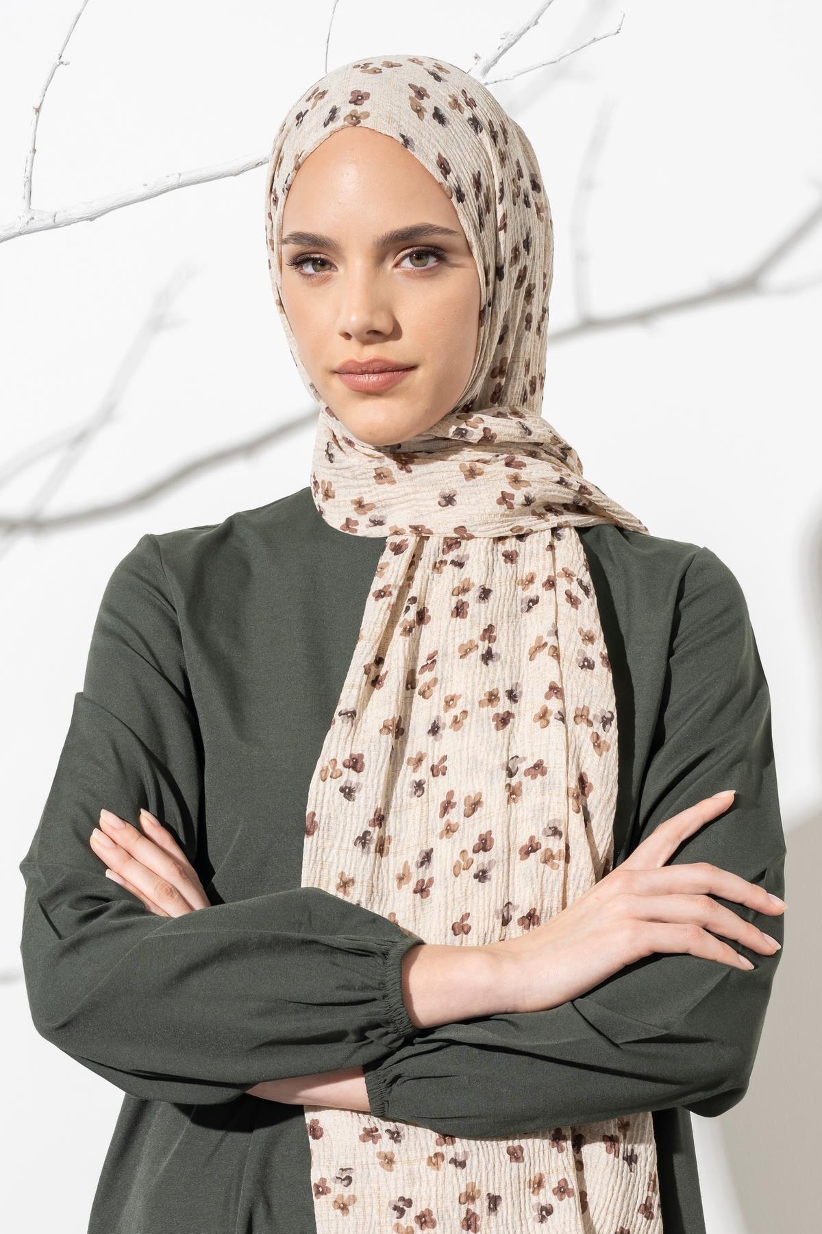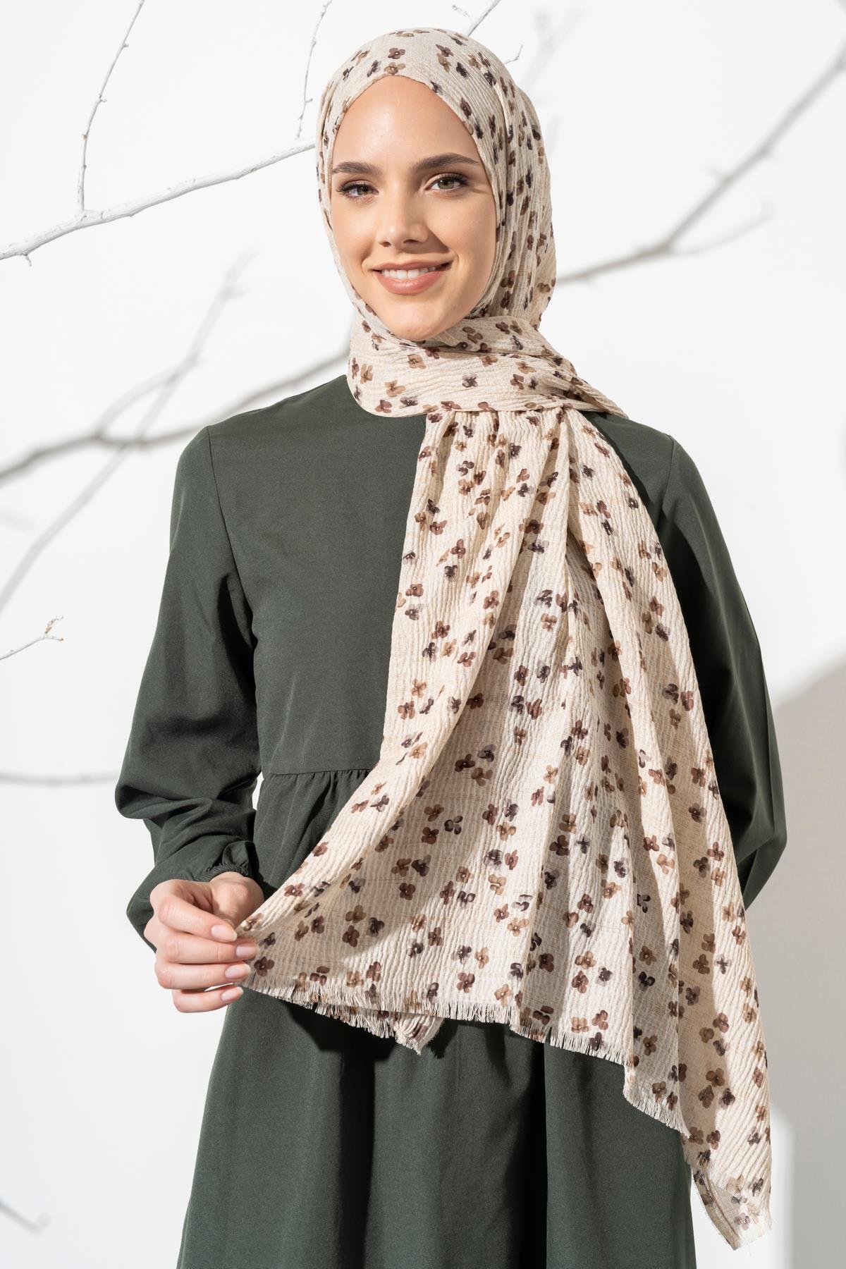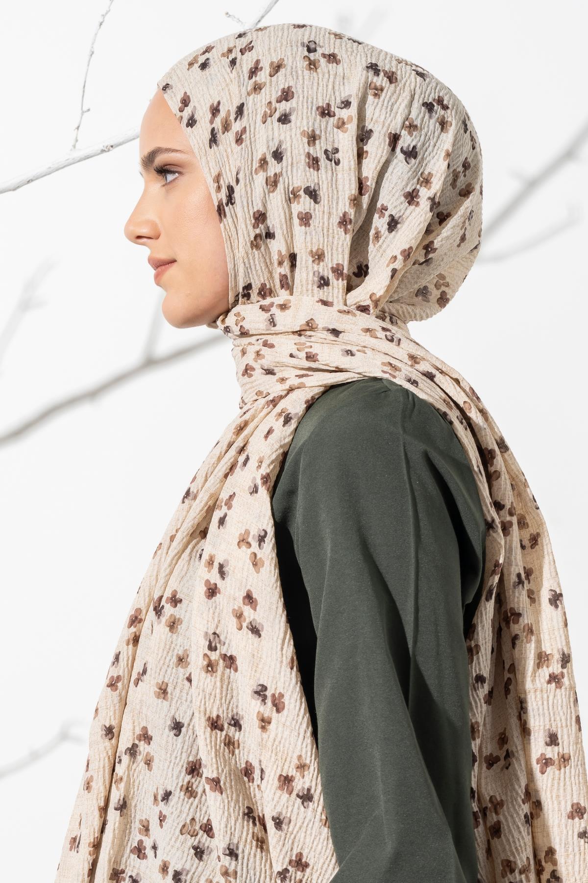 Kadın Çiçek Desenli Kırışmaz Bürümcük Şal 190*80 Cm KREM KAHVE