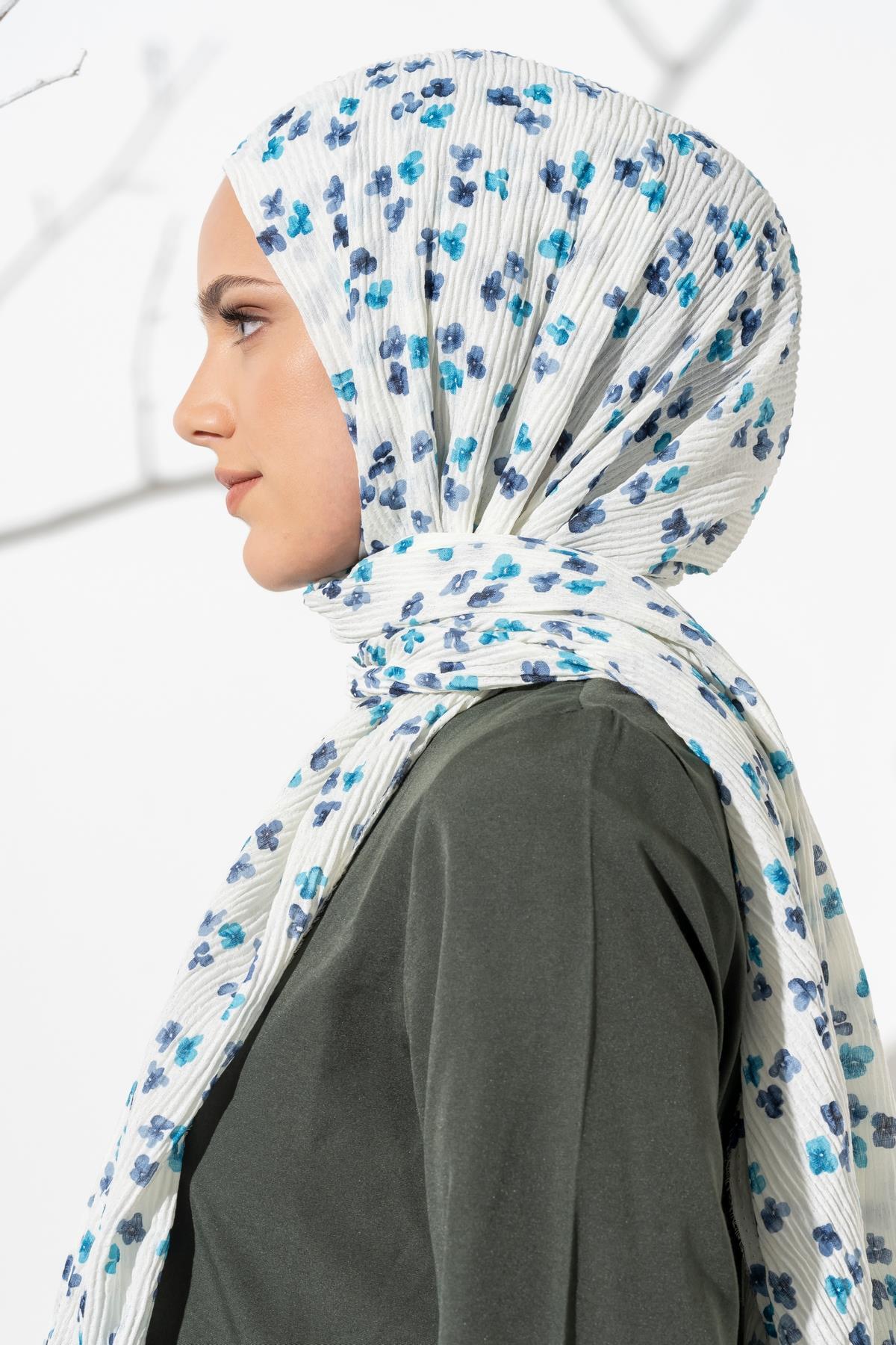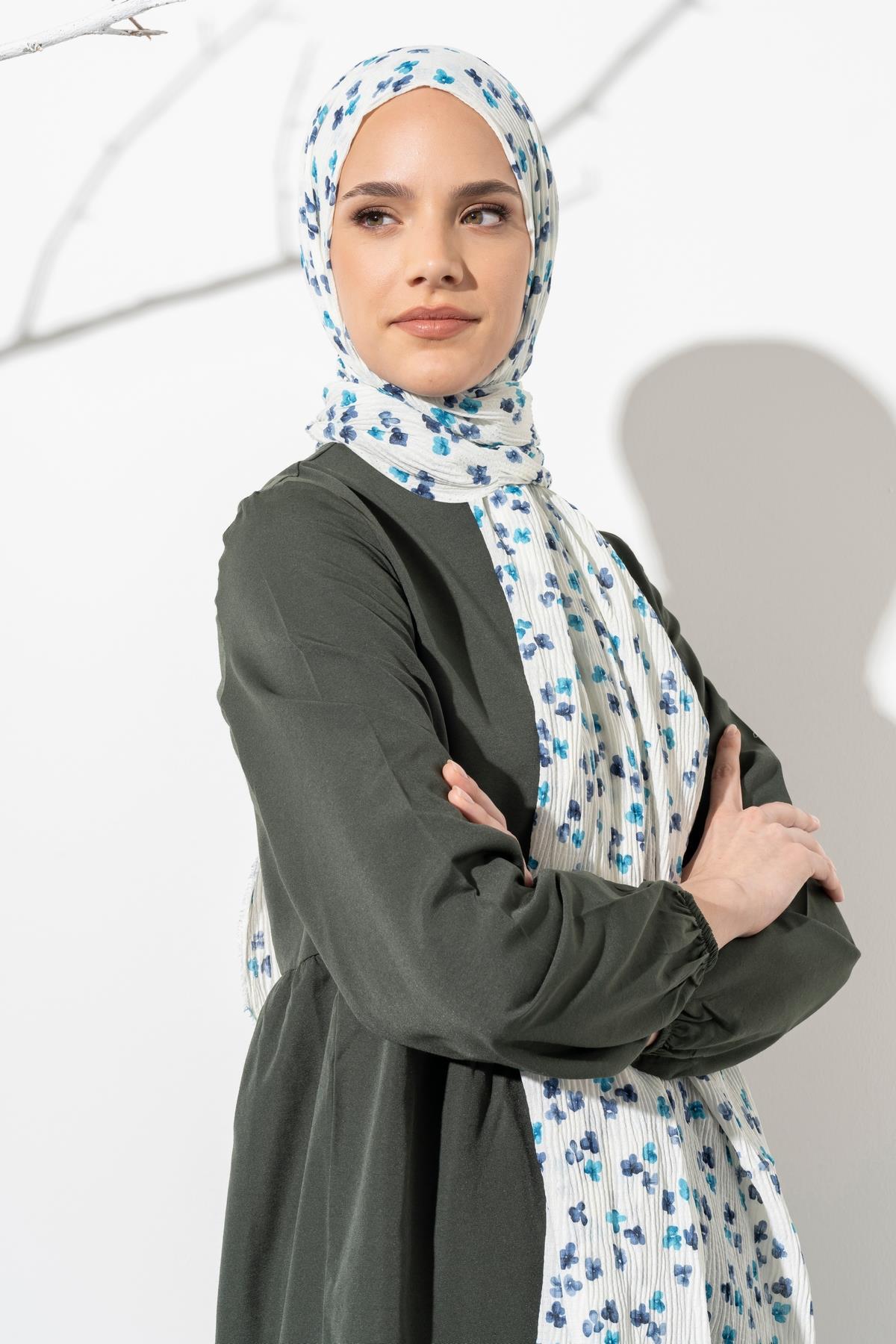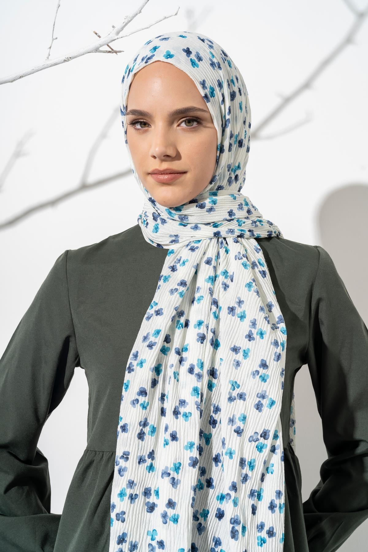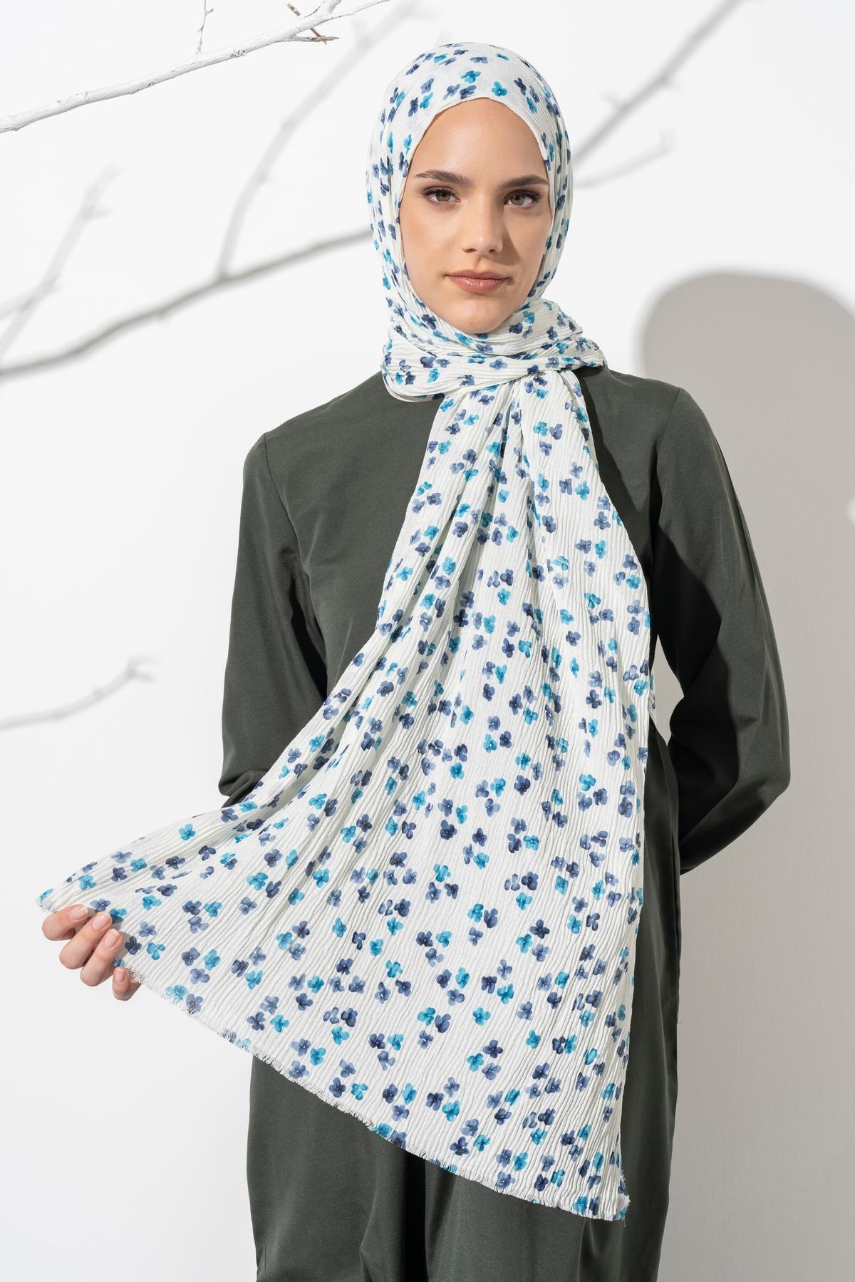 Kadın Çiçek Desenli Kırışmaz Bürümcük Şal 190*80 Cm KREM MAVİ