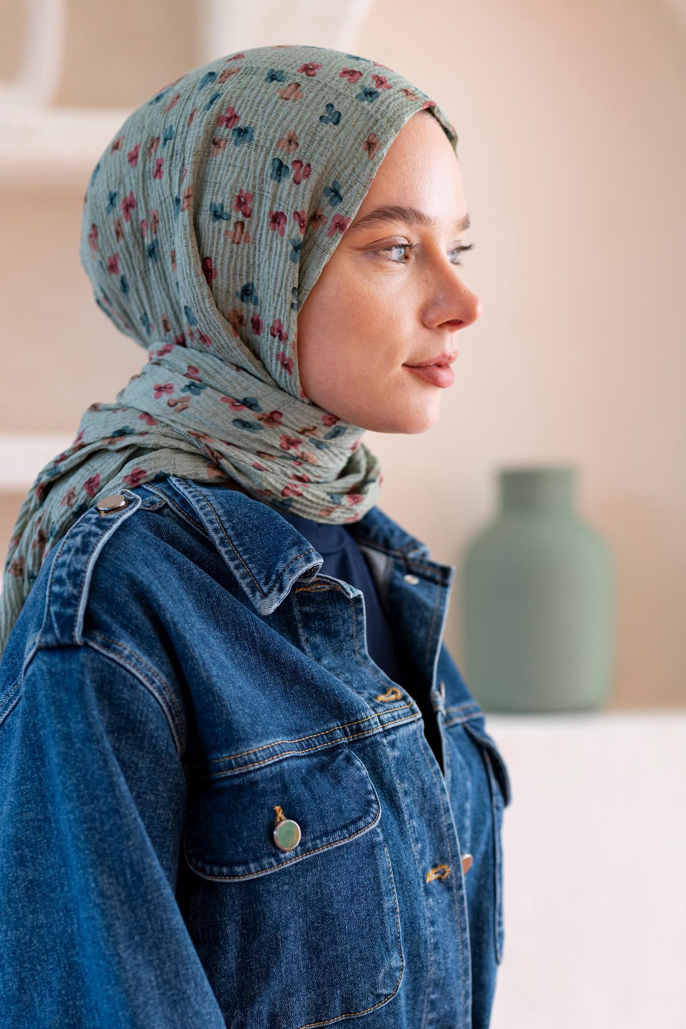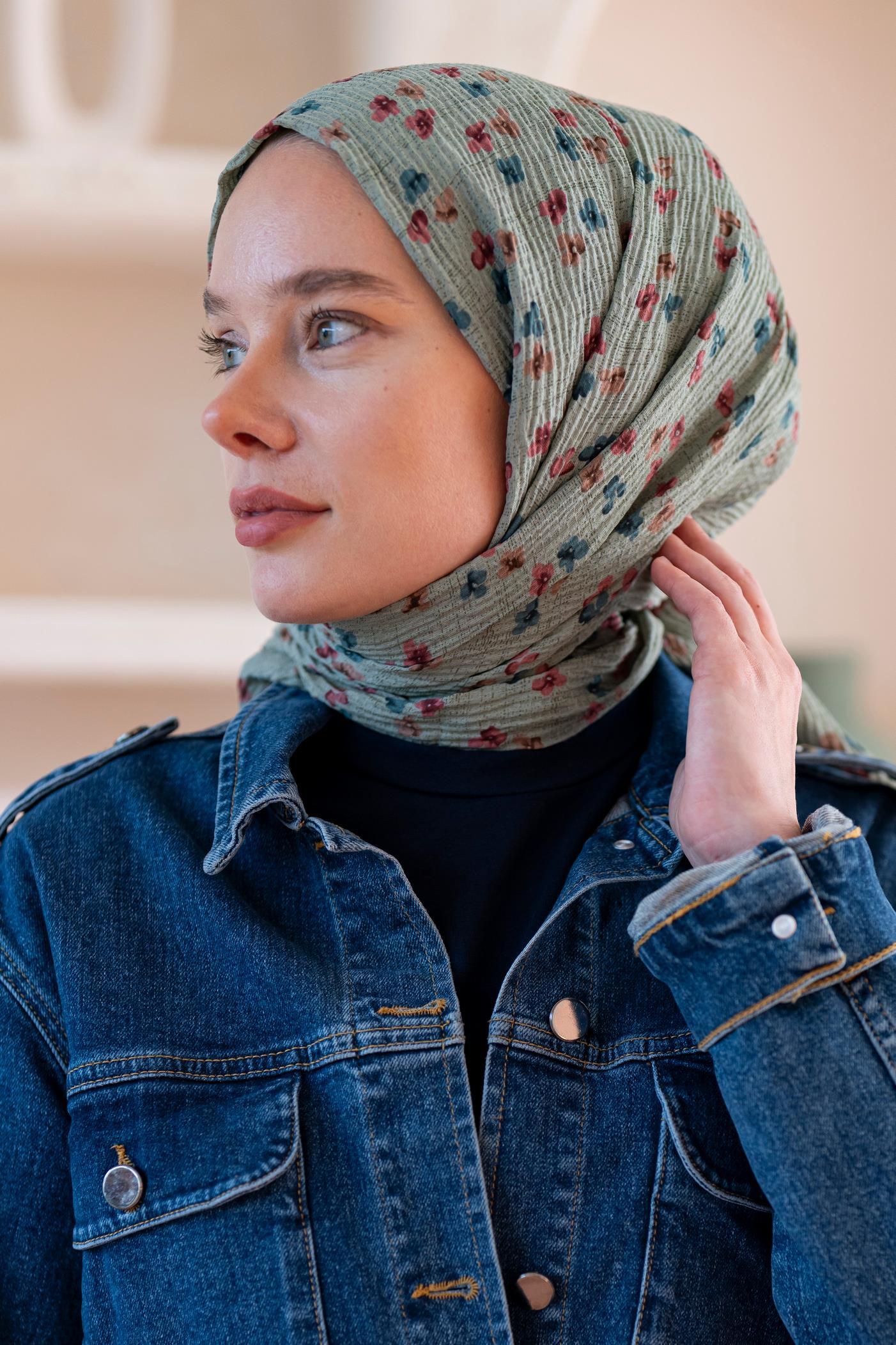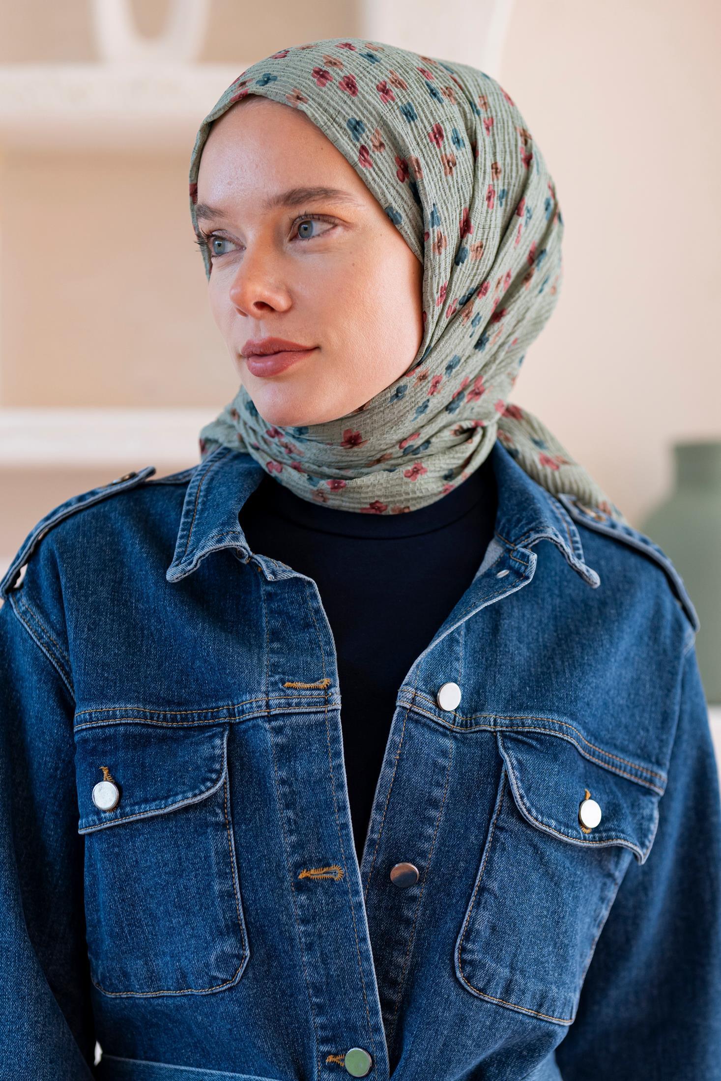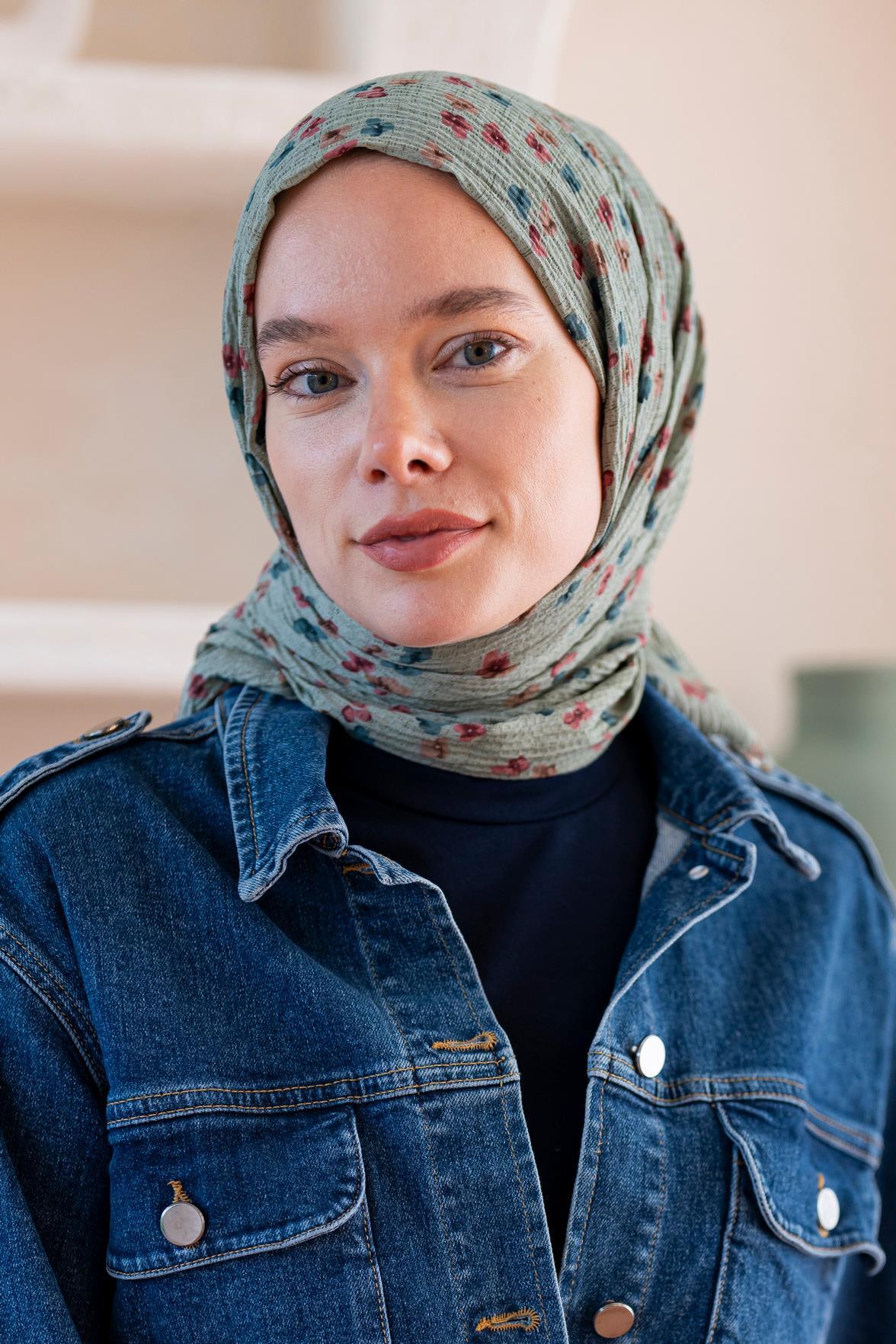 Kadın Çiçek Desenli Kırışmaz Bürümcük Şal 190*80 Cm KÜF YEŞİLİ