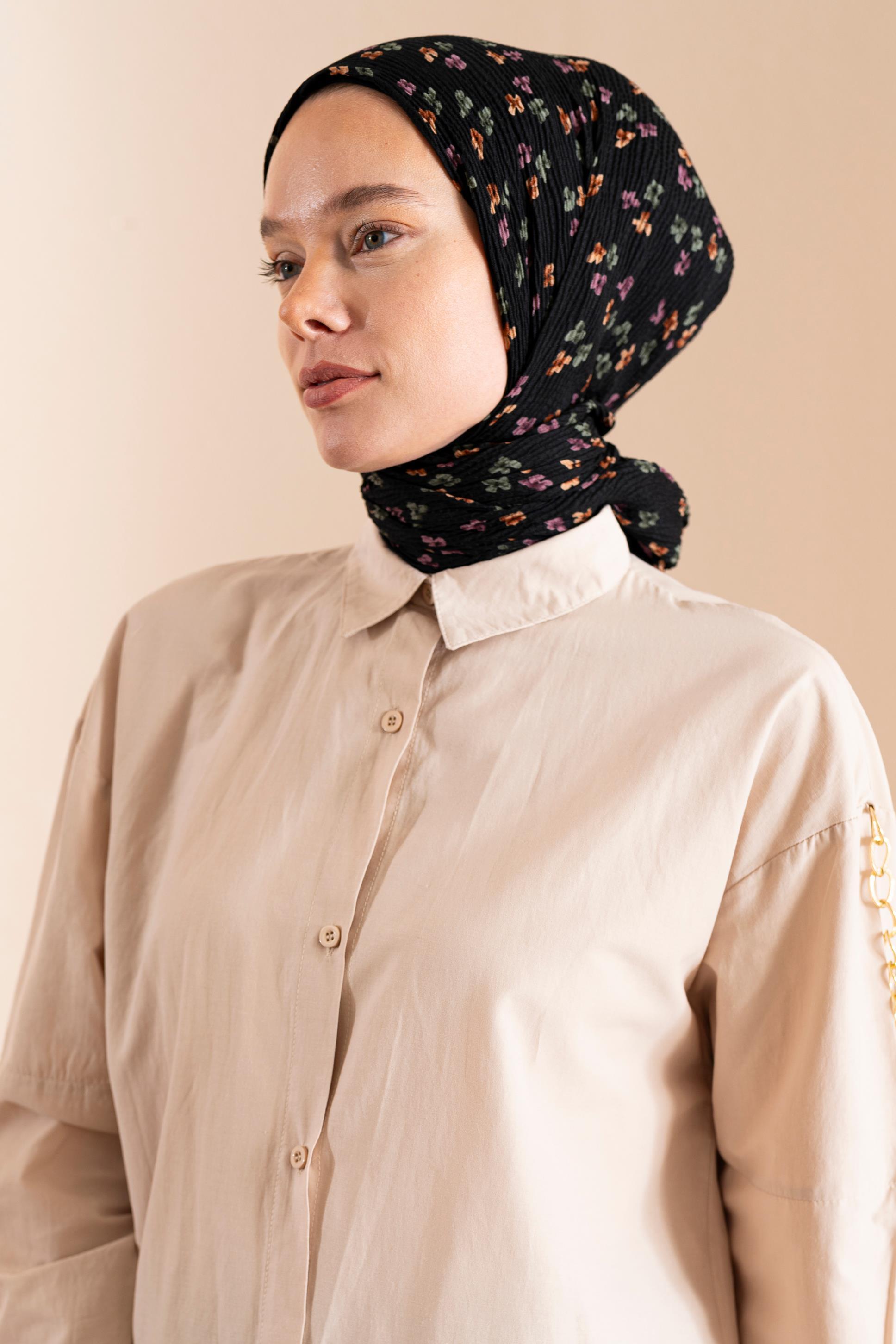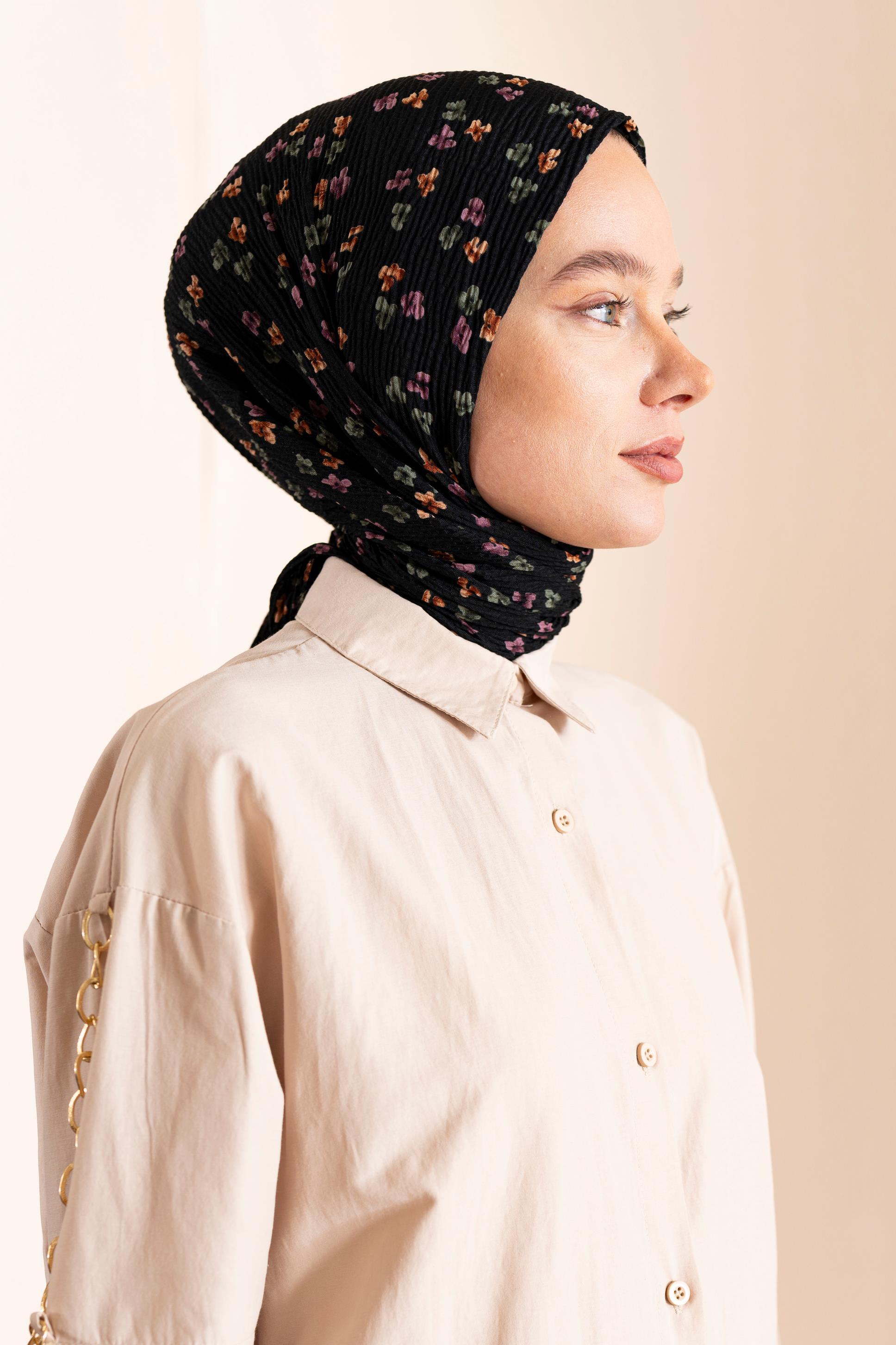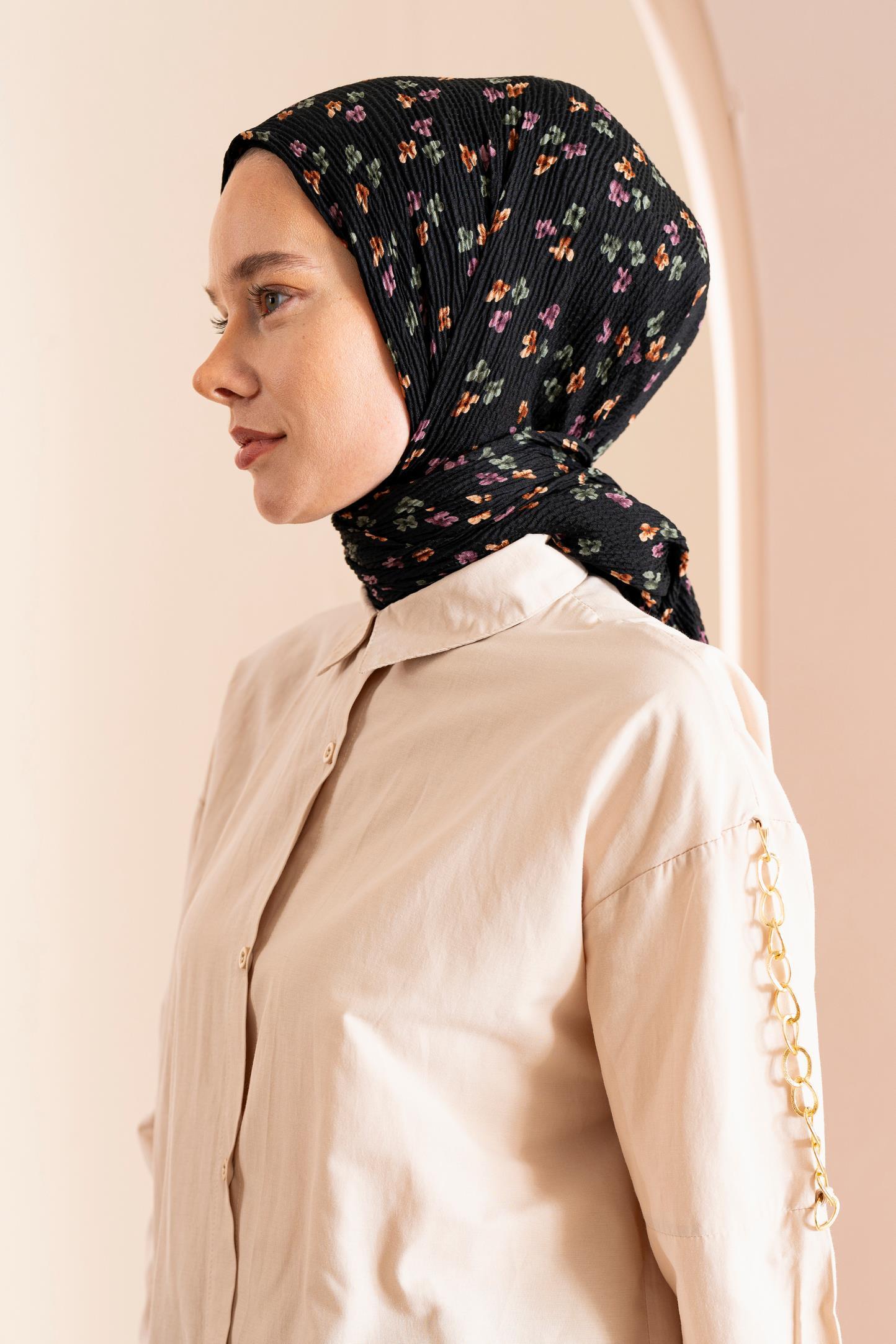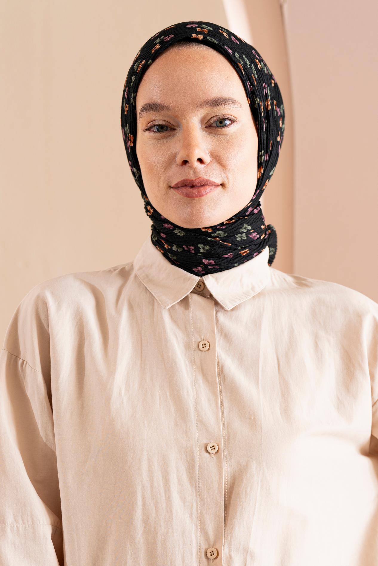 Kadın Çiçek Desenli Kırışmaz Bürümcük Şal 190*80 Cm SİYAH HAKİ