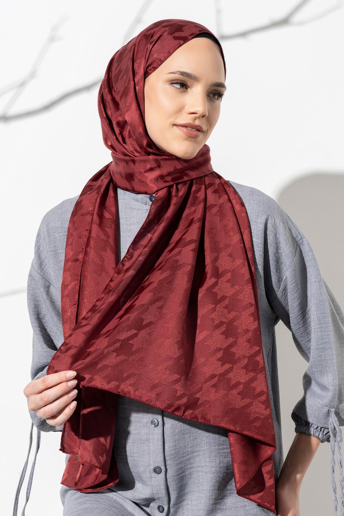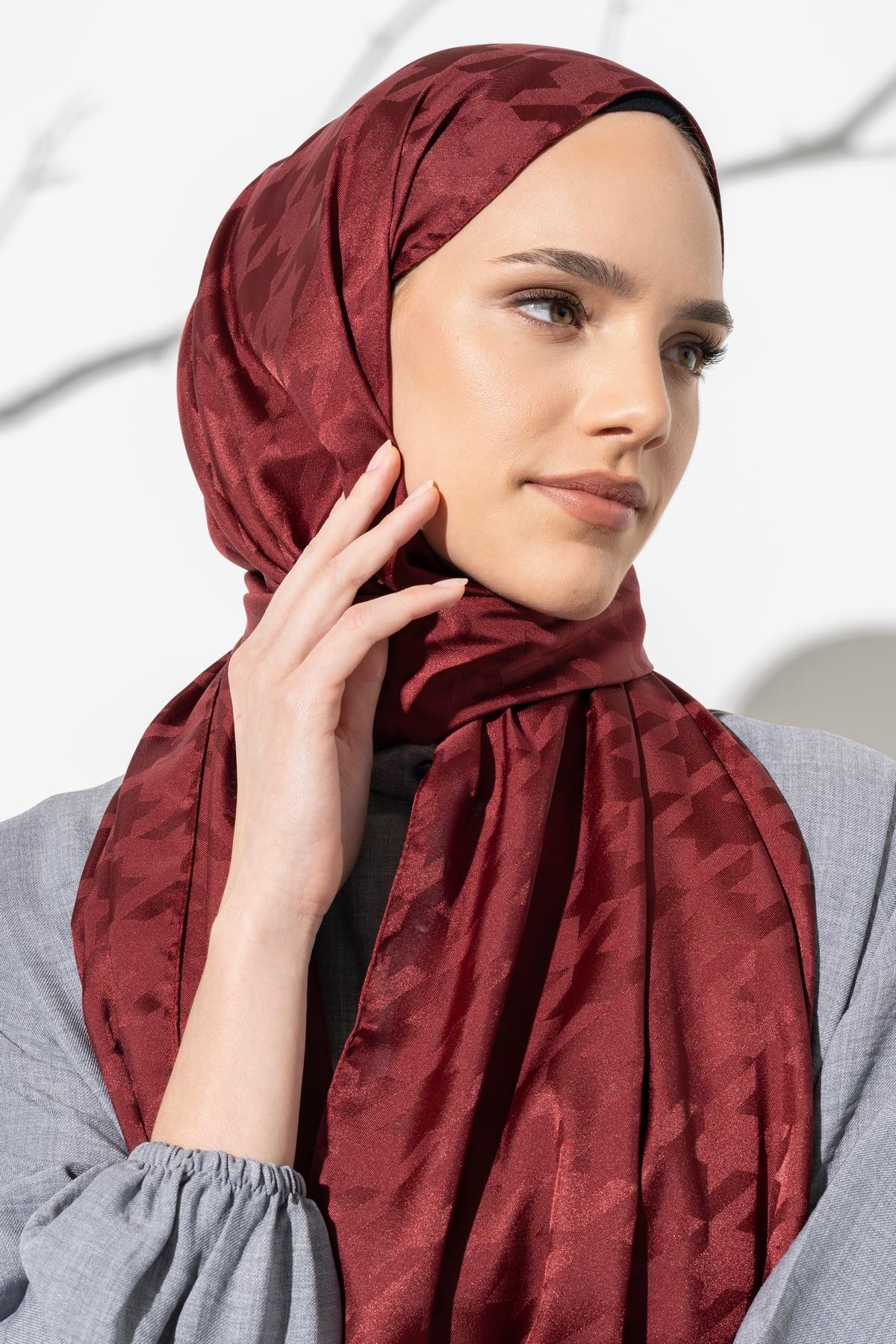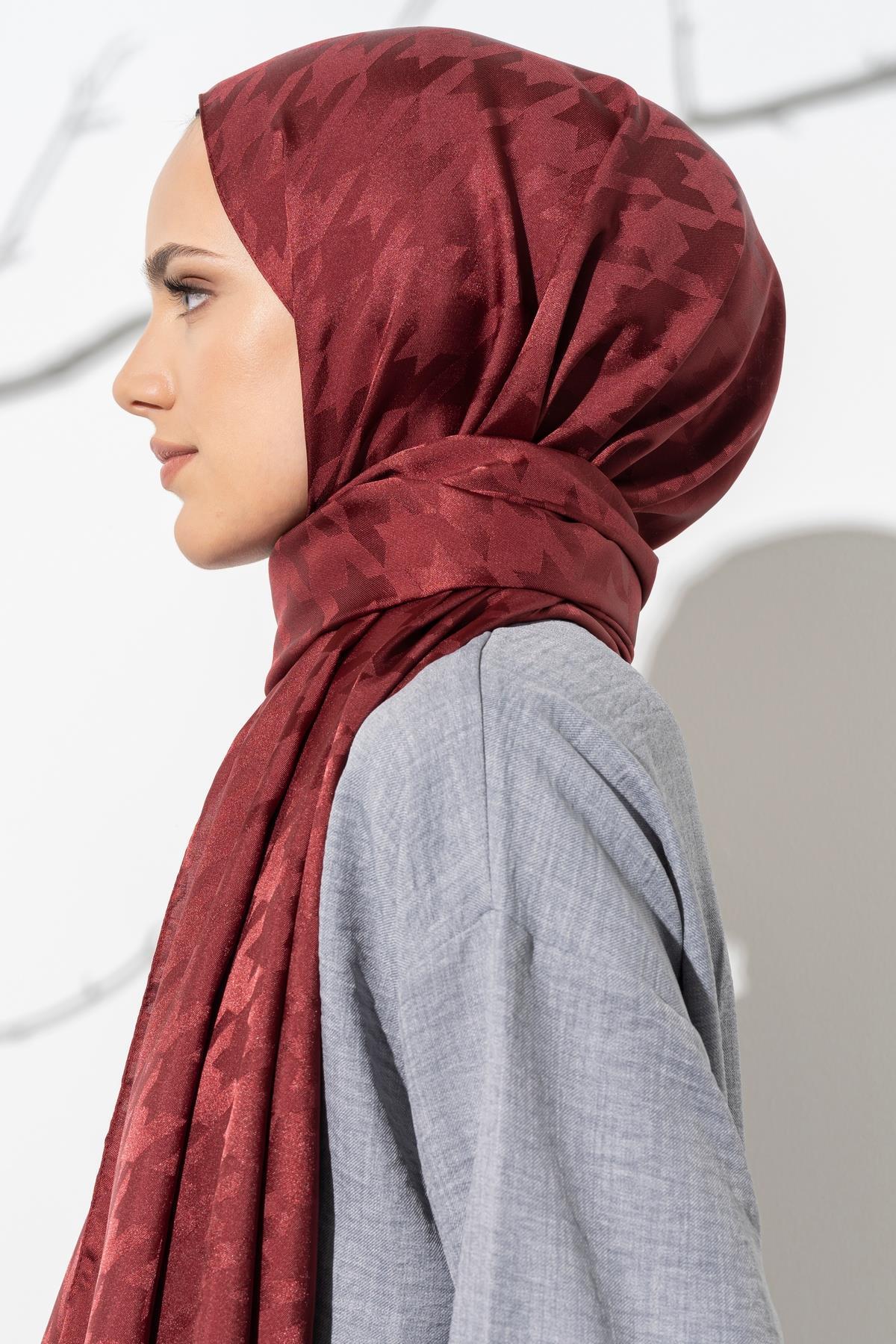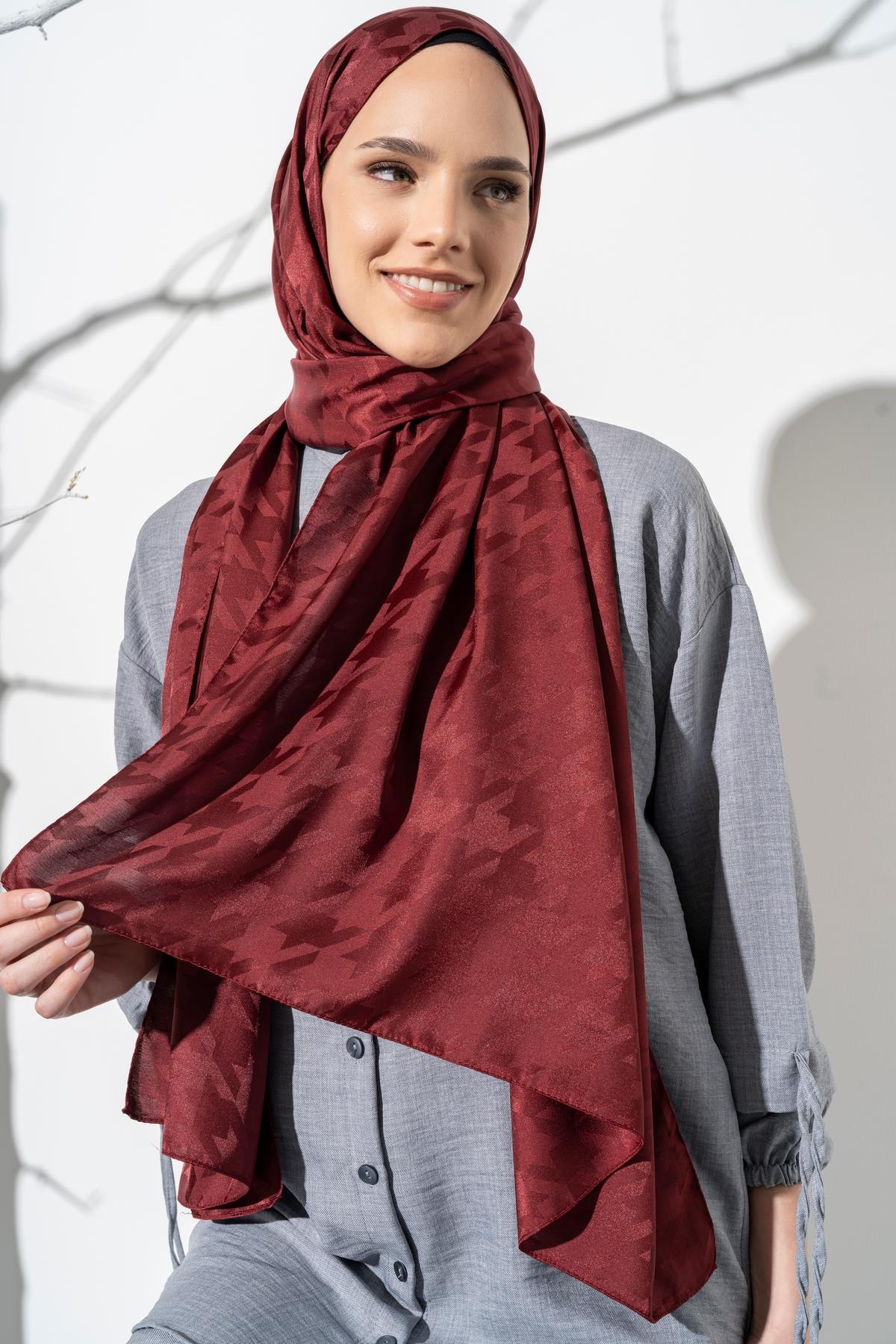 Kadın Tesettür Jakarlı Büyük Desen Kazayağı Şal BORDO