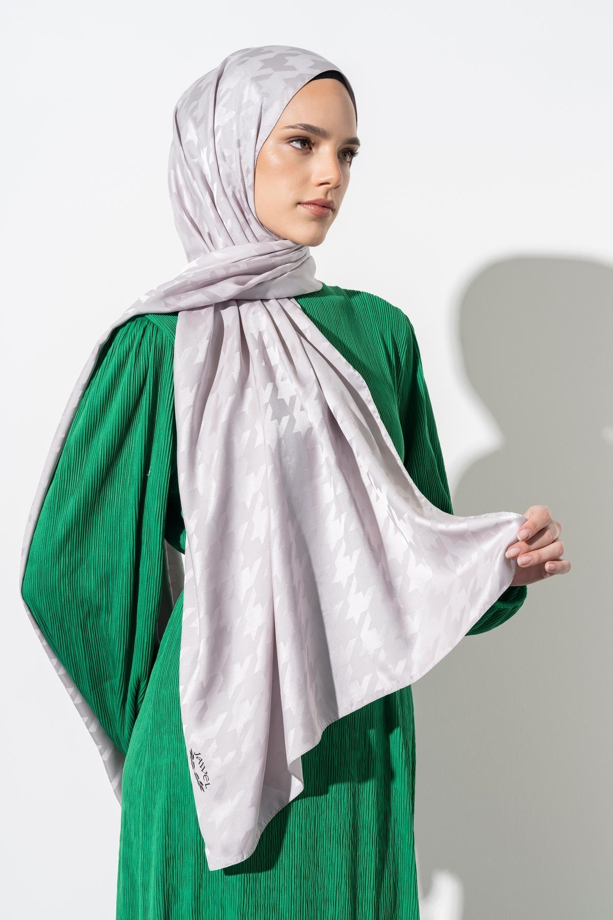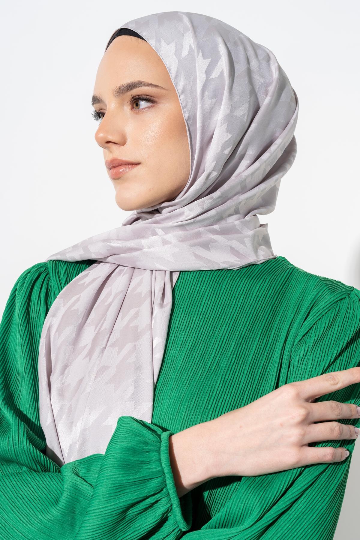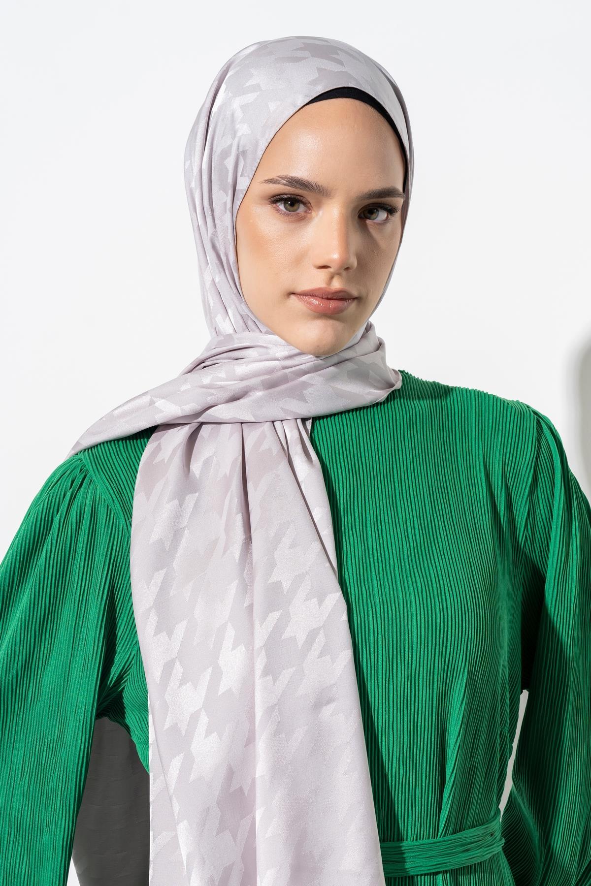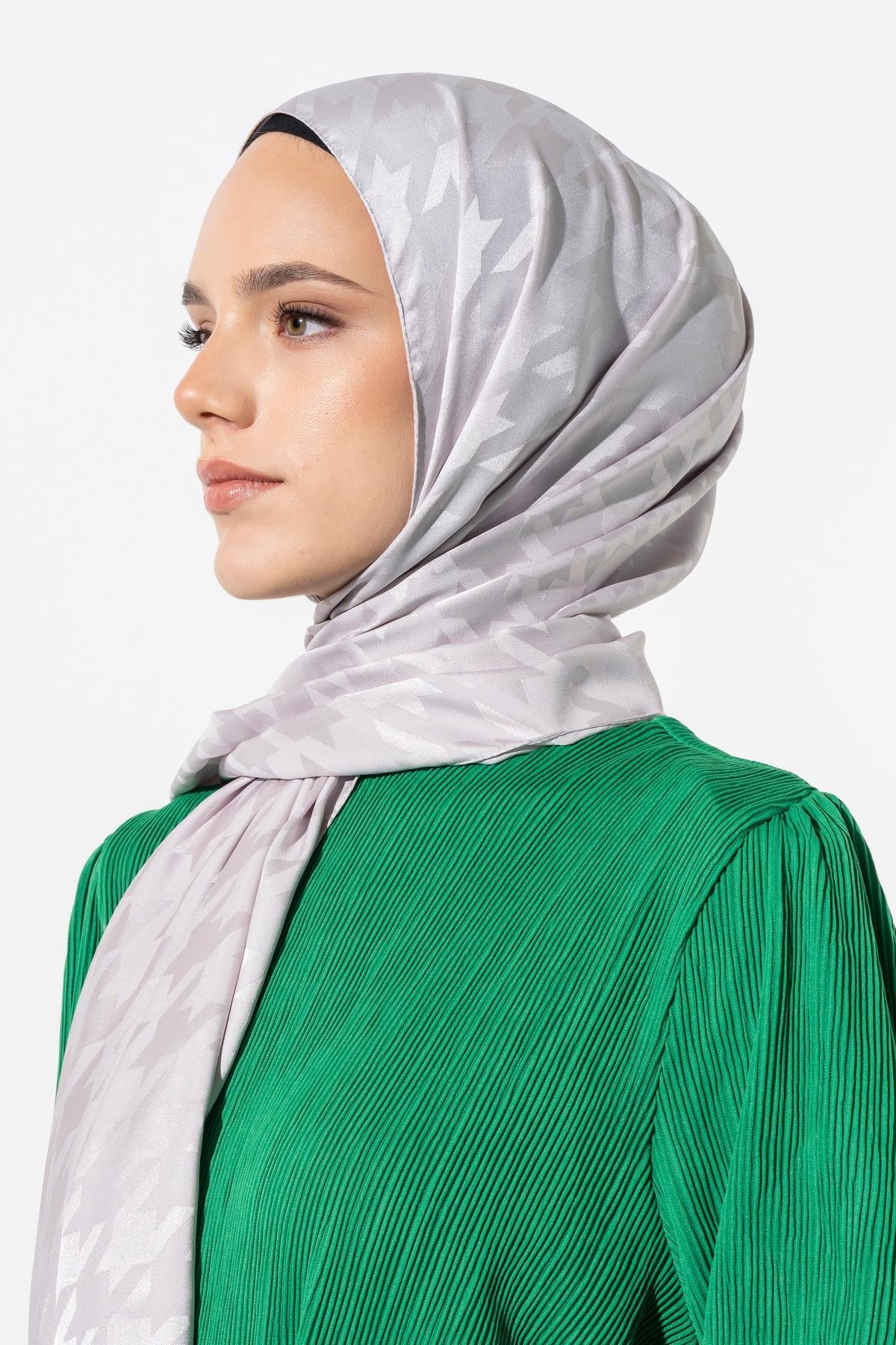 Kadın Tesettür Jakarlı Büyük Desen Kazayağı Şal GÜMÜŞ GRİ