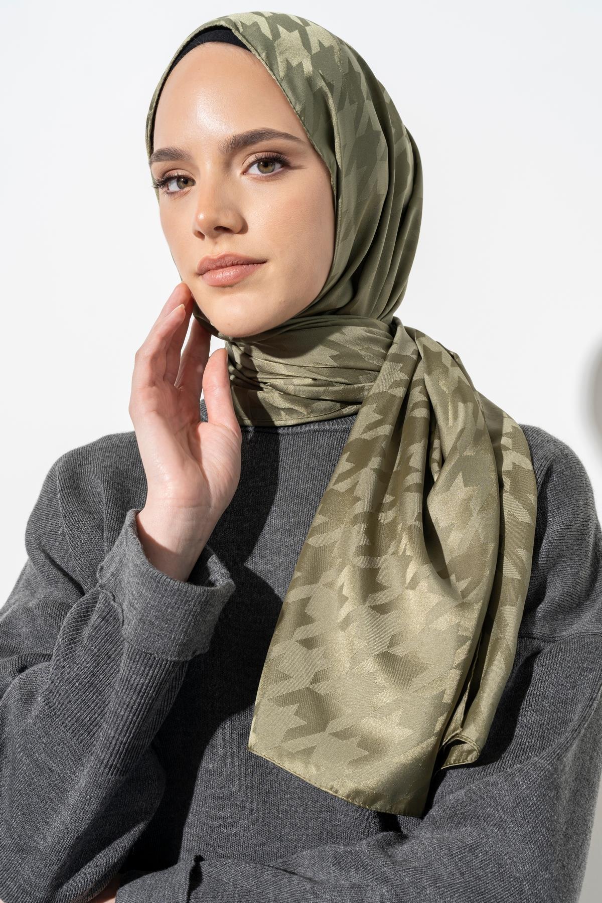 Kadın Tesettür Jakarlı Büyük Desen Kazayağı Şal HAKİ