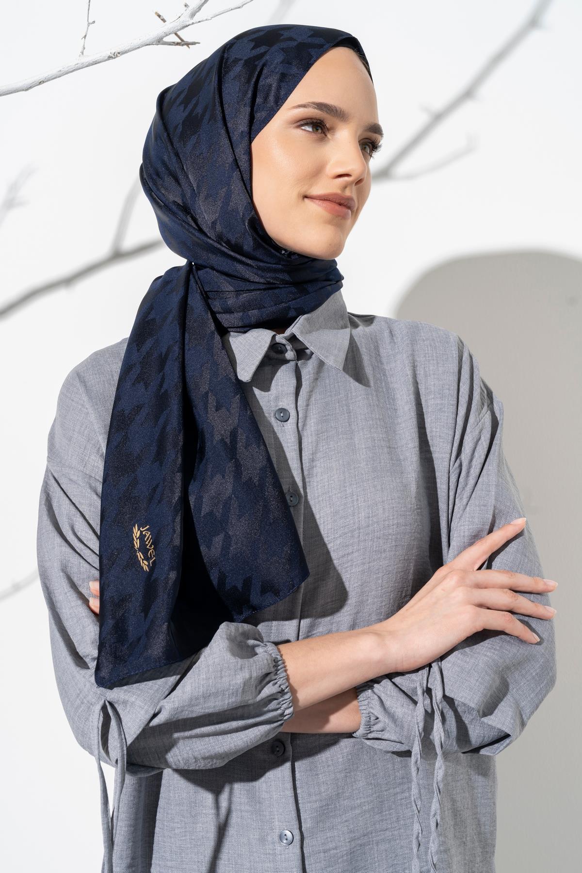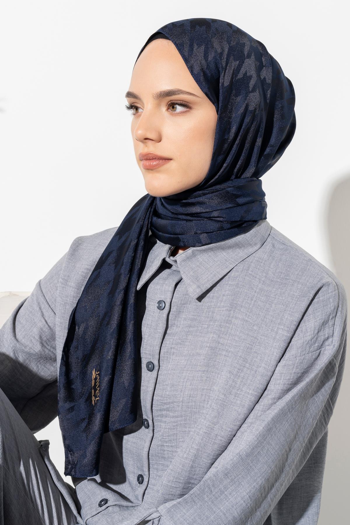 Kadın Tesettür Jakarlı Büyük Desen Kazayağı Şal LACİVERT