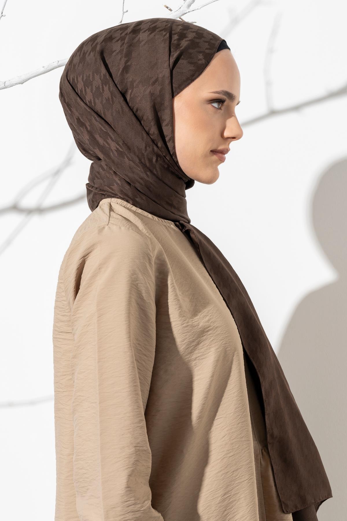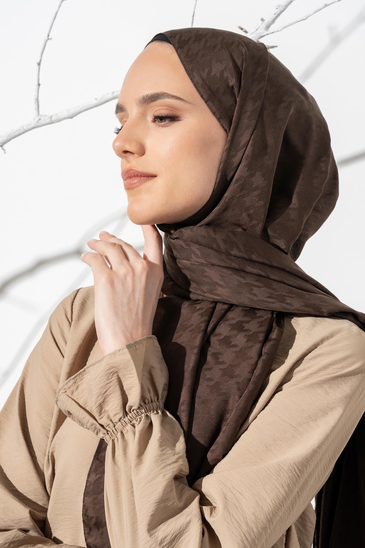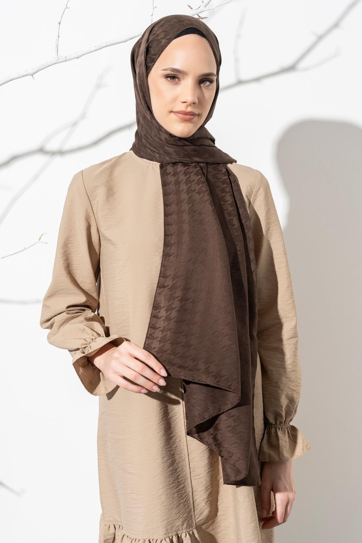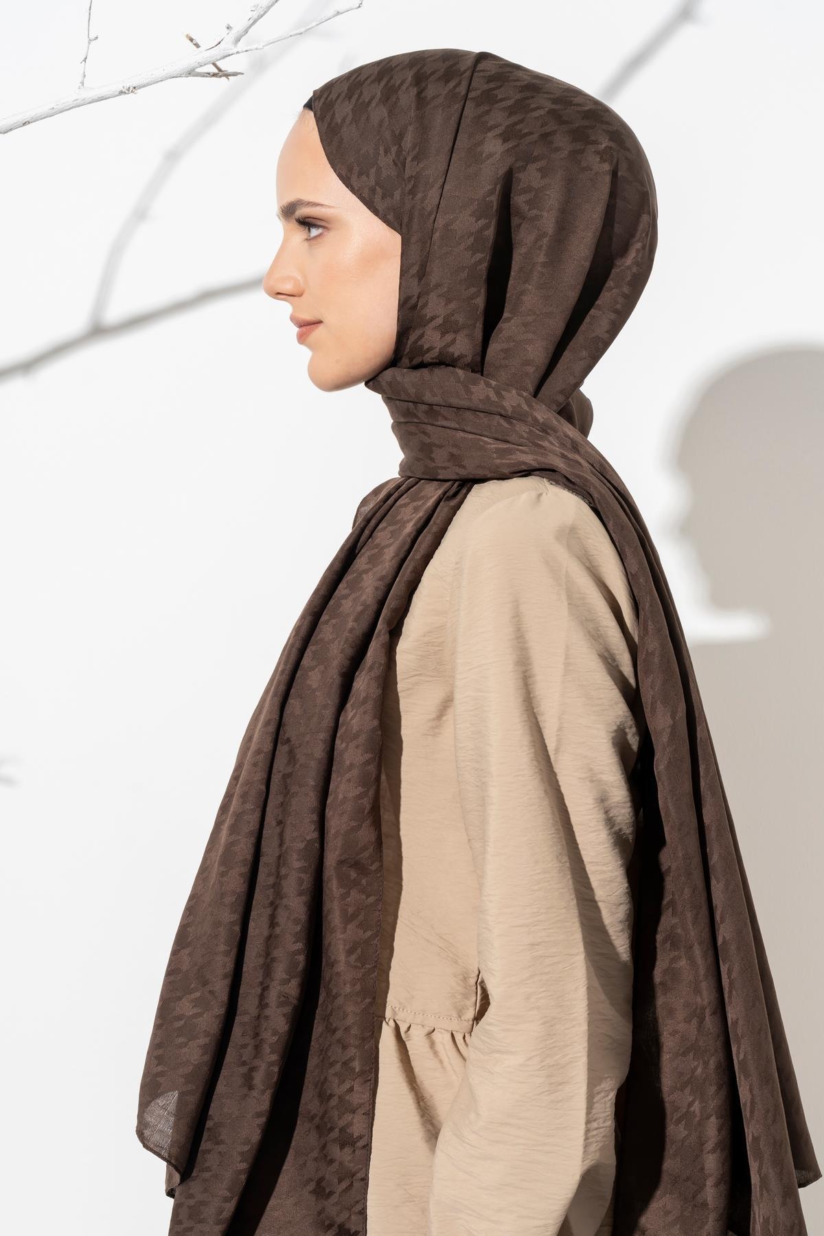 Kadın Tesettür Jakarlı Küçük Desen Kazayağı Şal ACI KAHVE