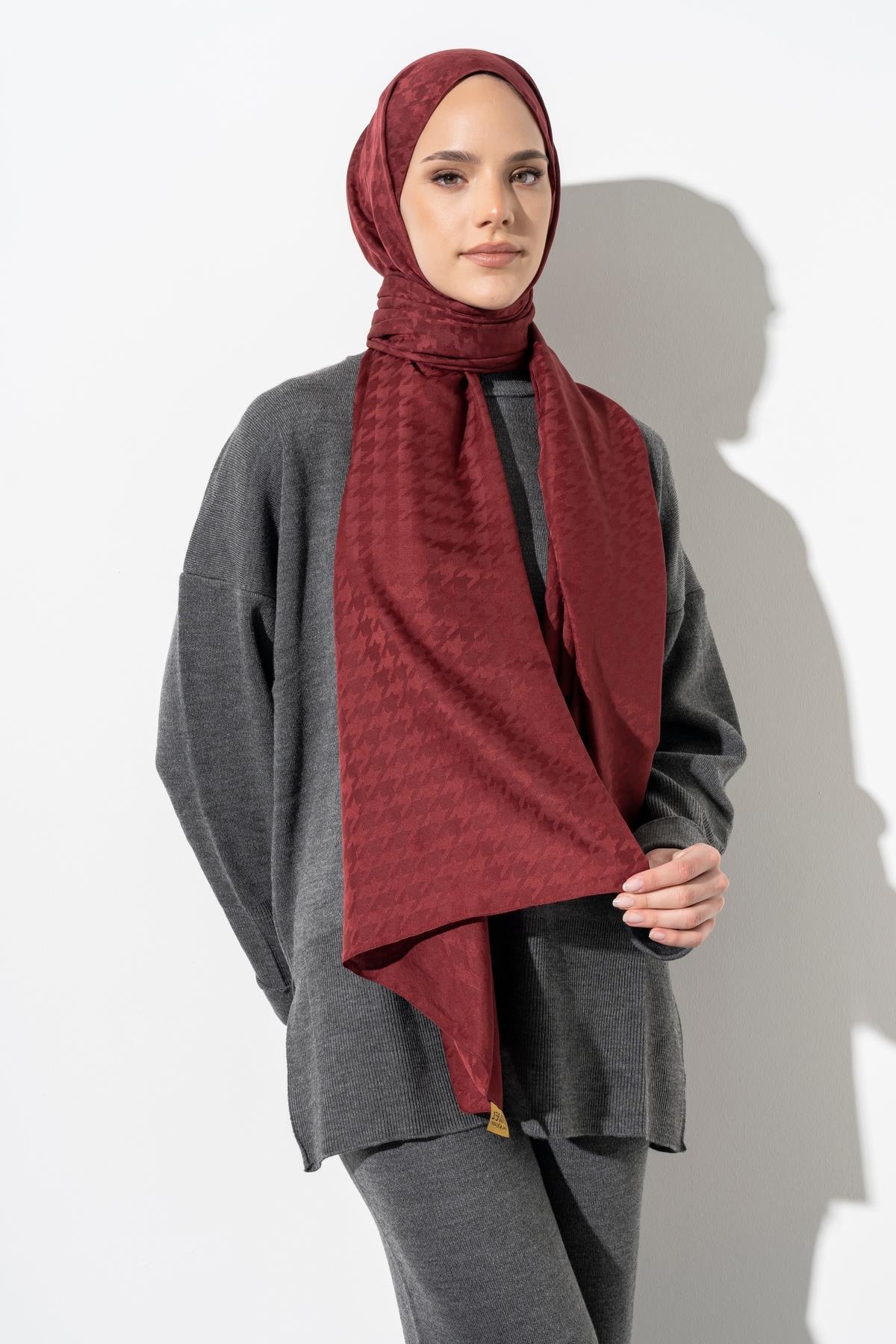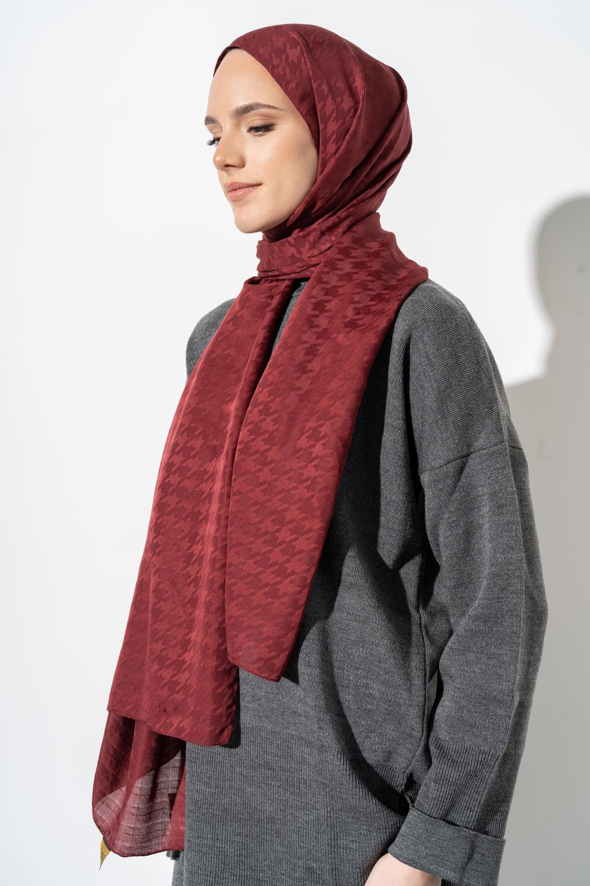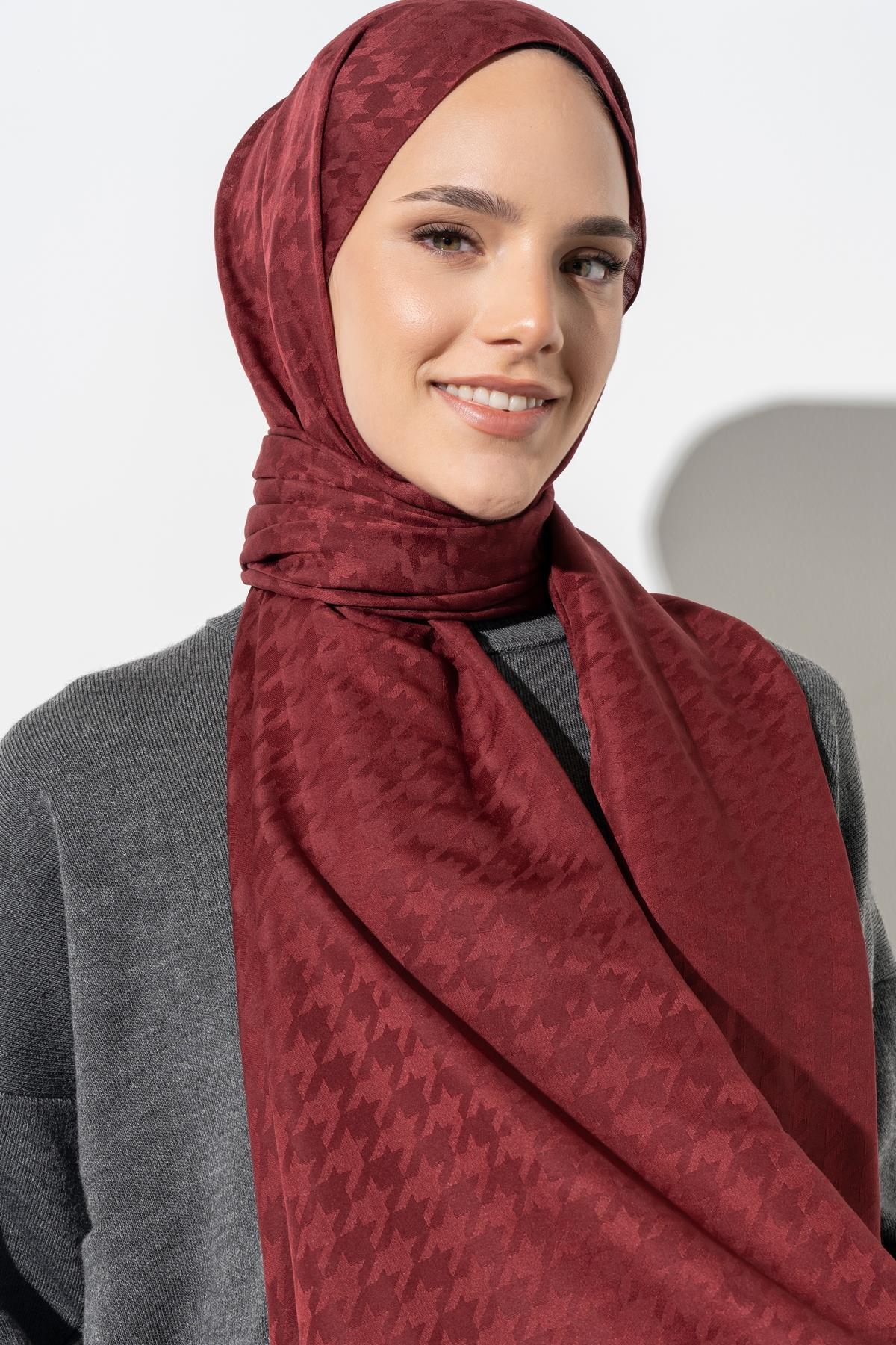 Kadın Tesettür Jakarlı Küçük Desen Kazayağı Şal BORDO