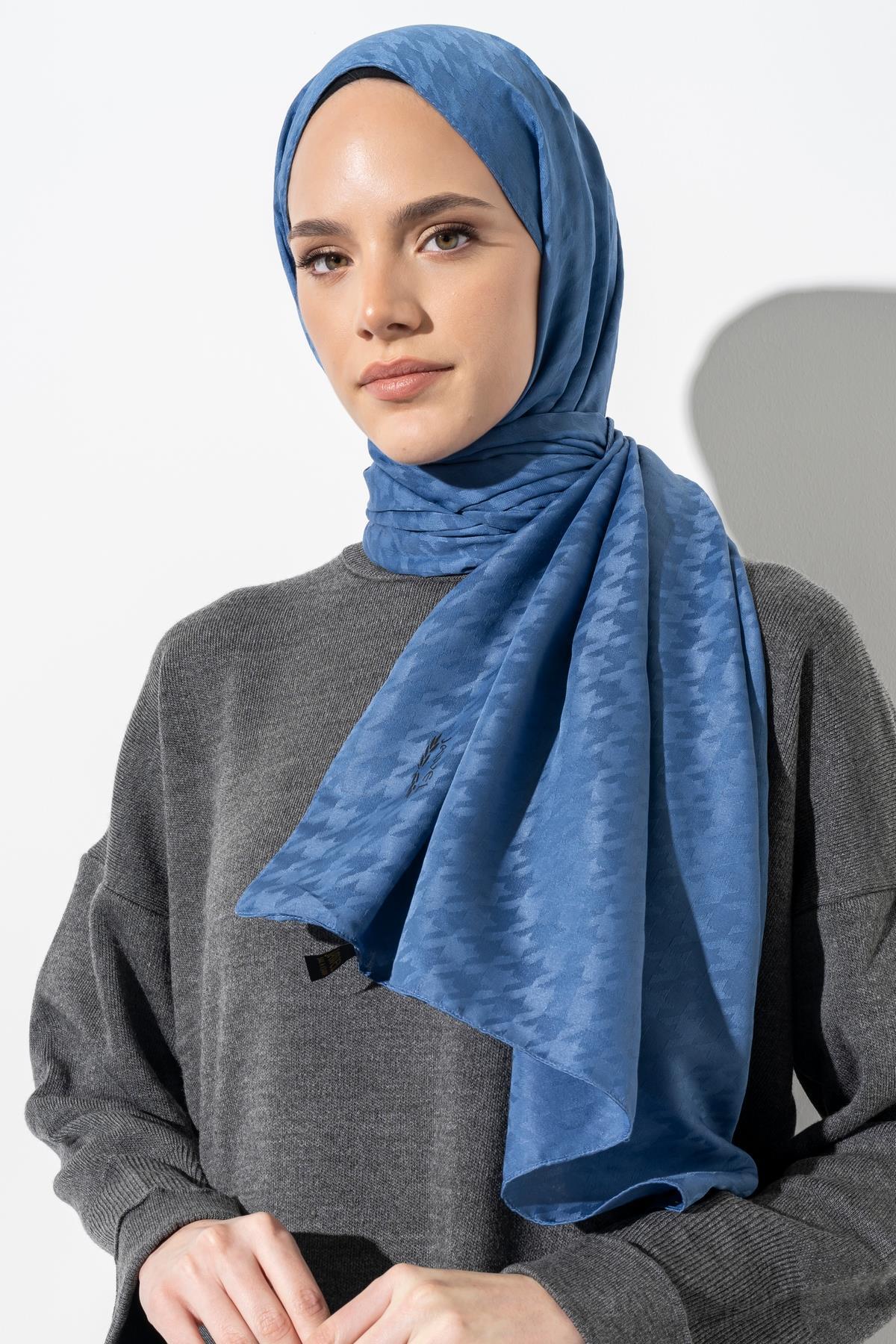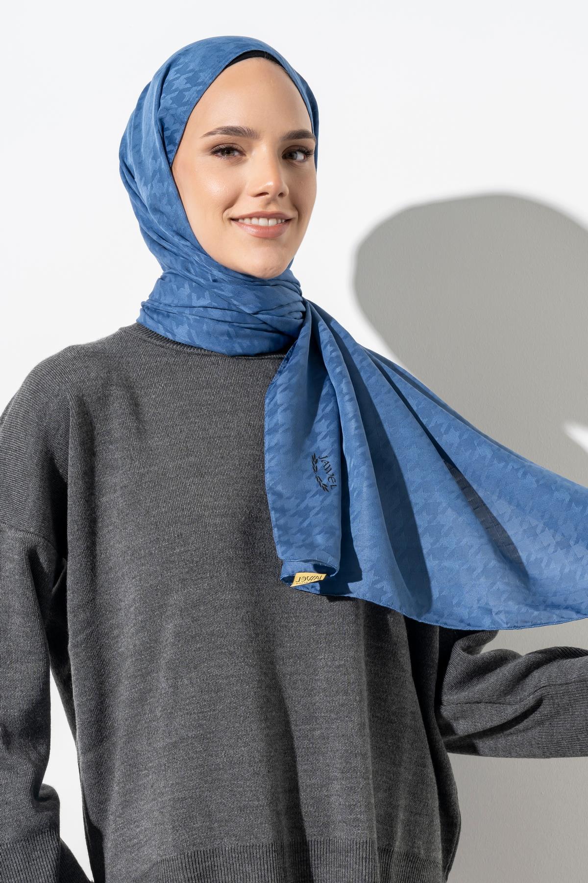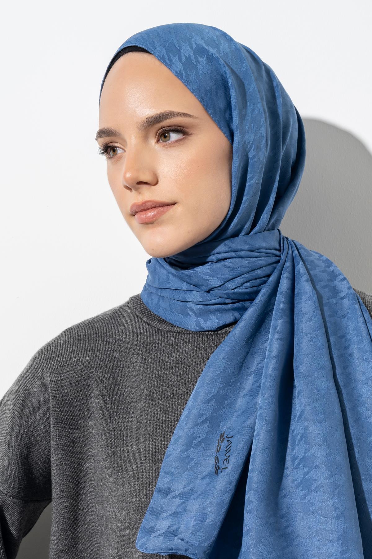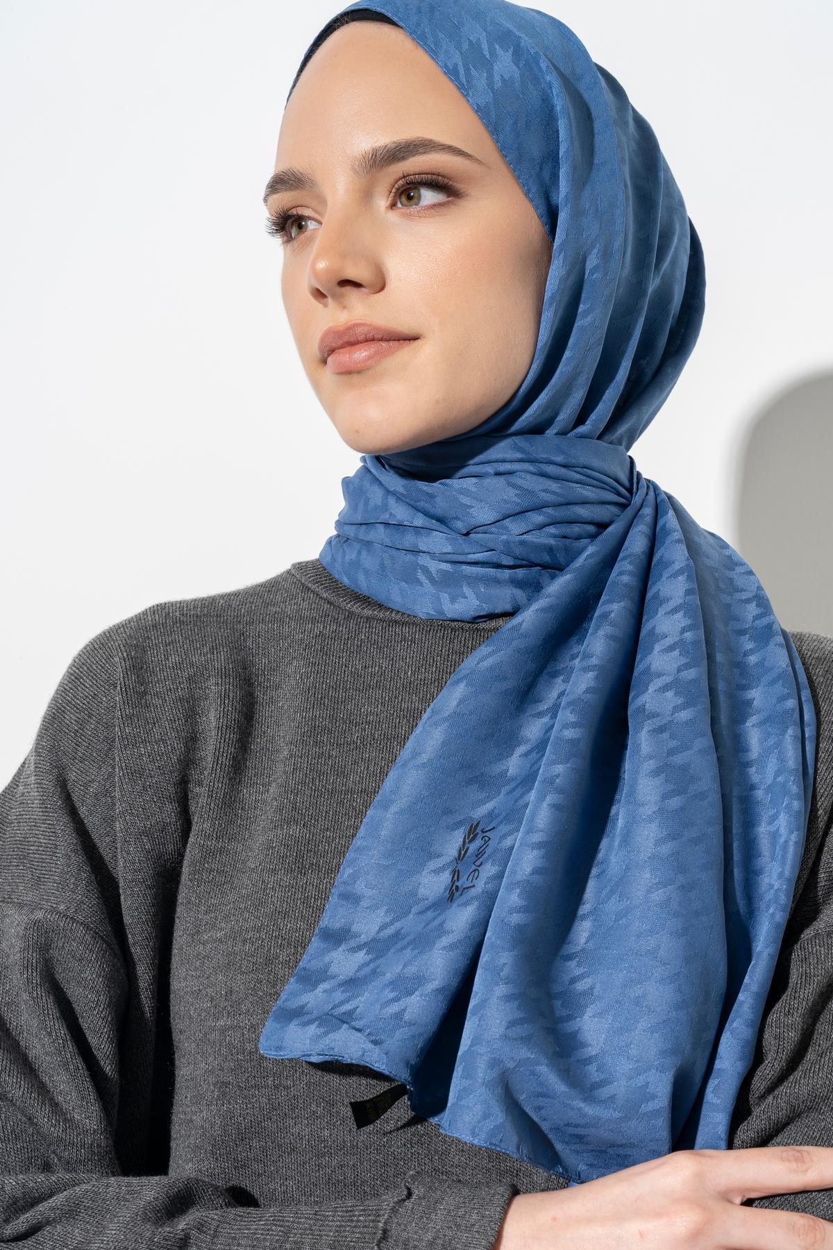 Kadın Tesettür Jakarlı Küçük Desen Kazayağı Şal İNDİGO