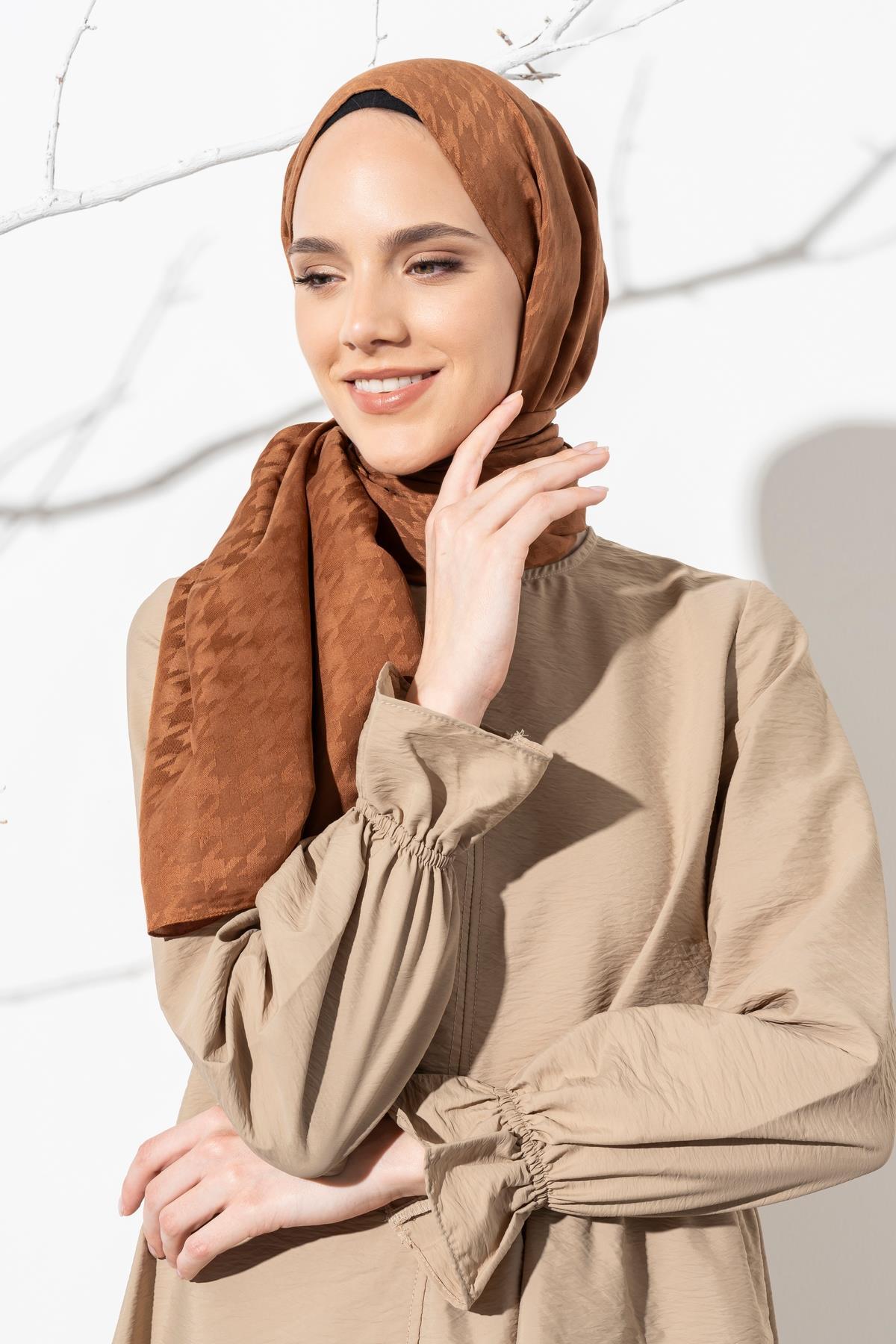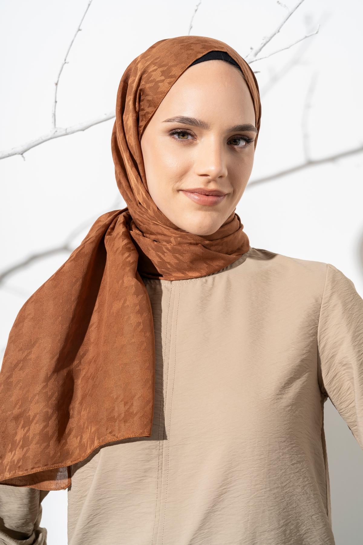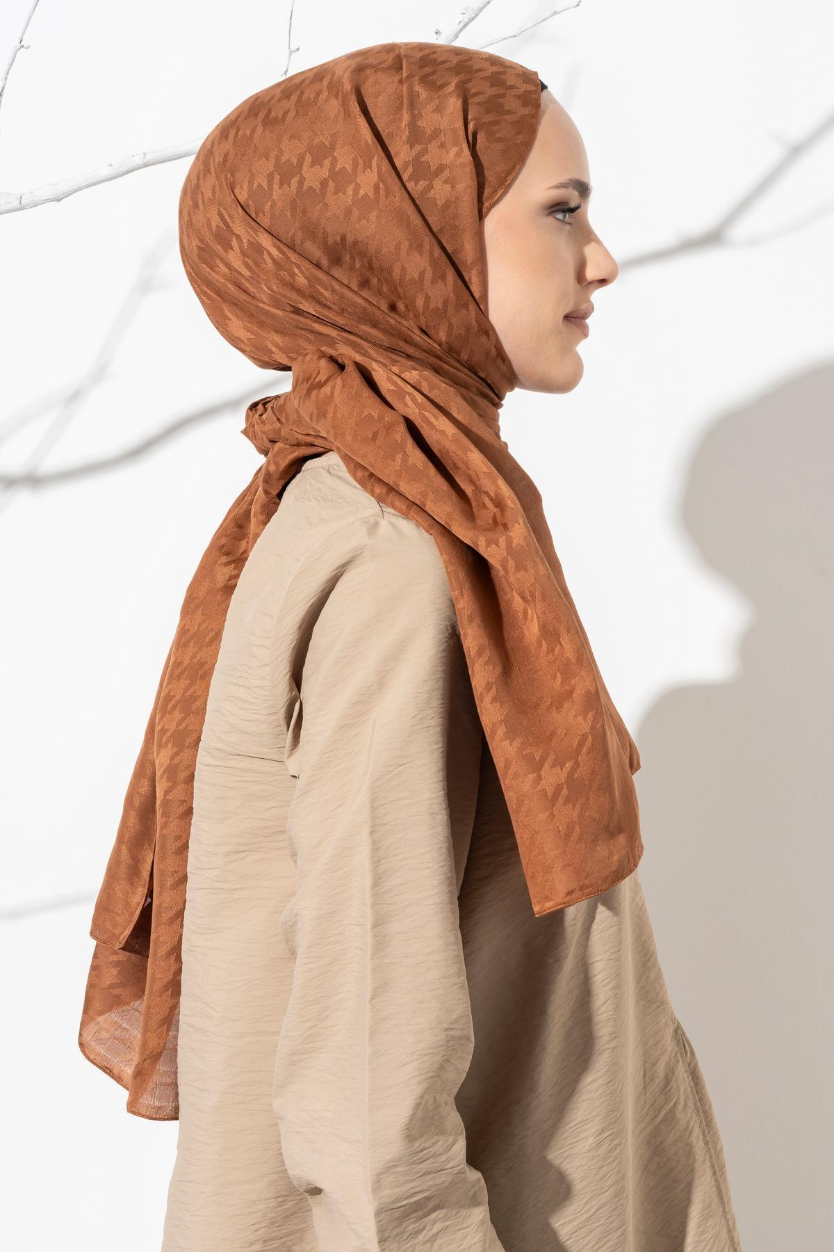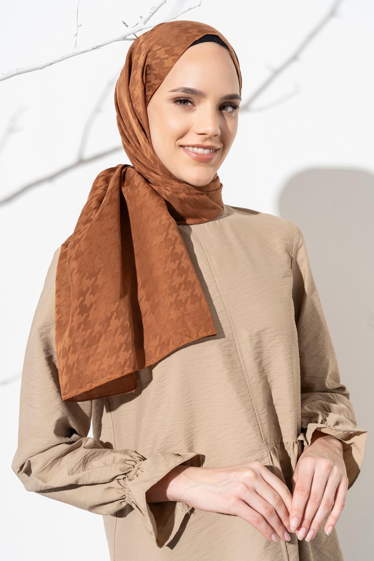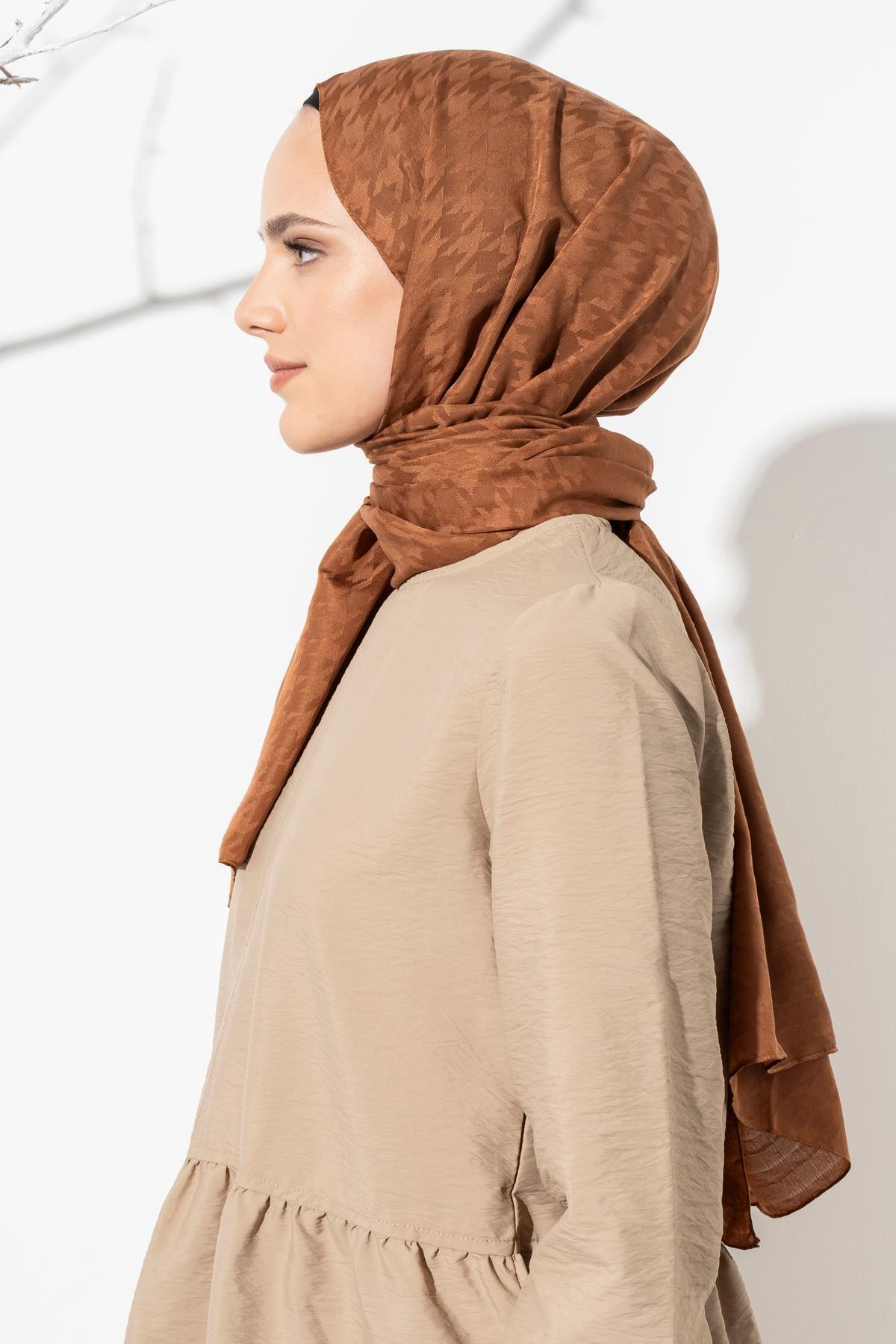 Kadın Tesettür Jakarlı Küçük Desen Kazayağı Şal KAHVE