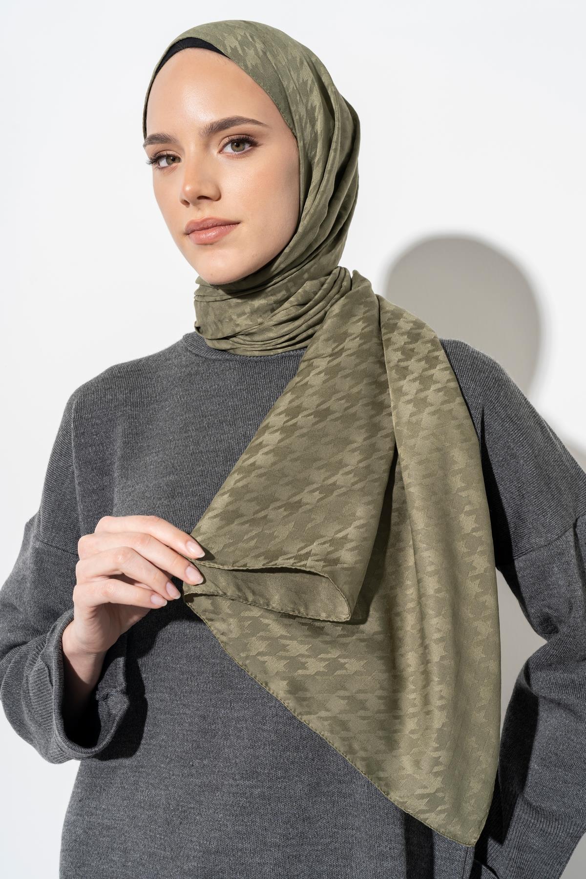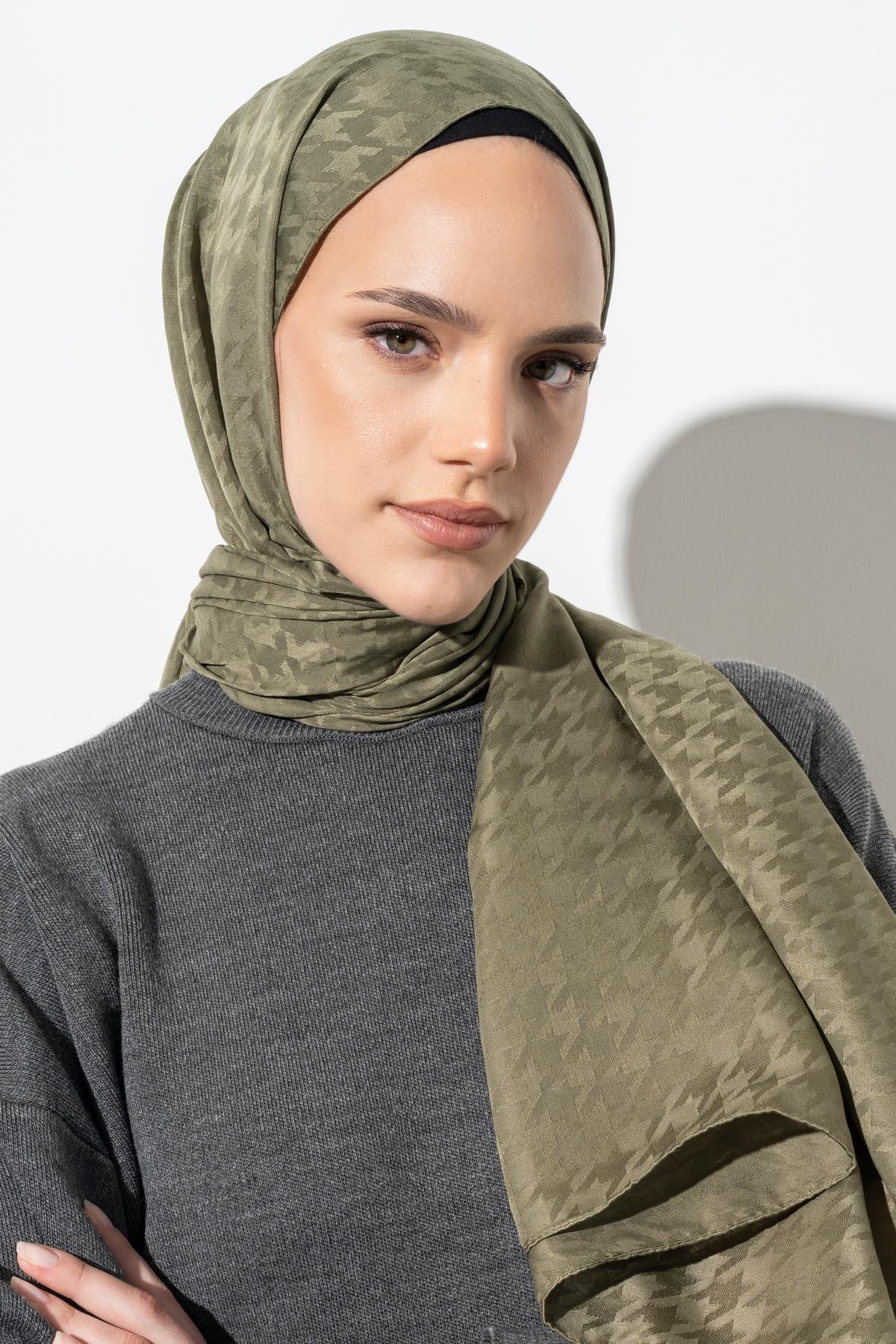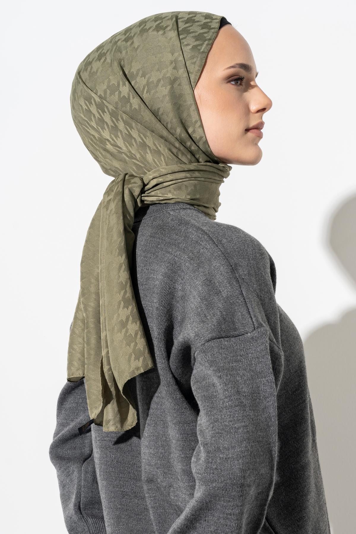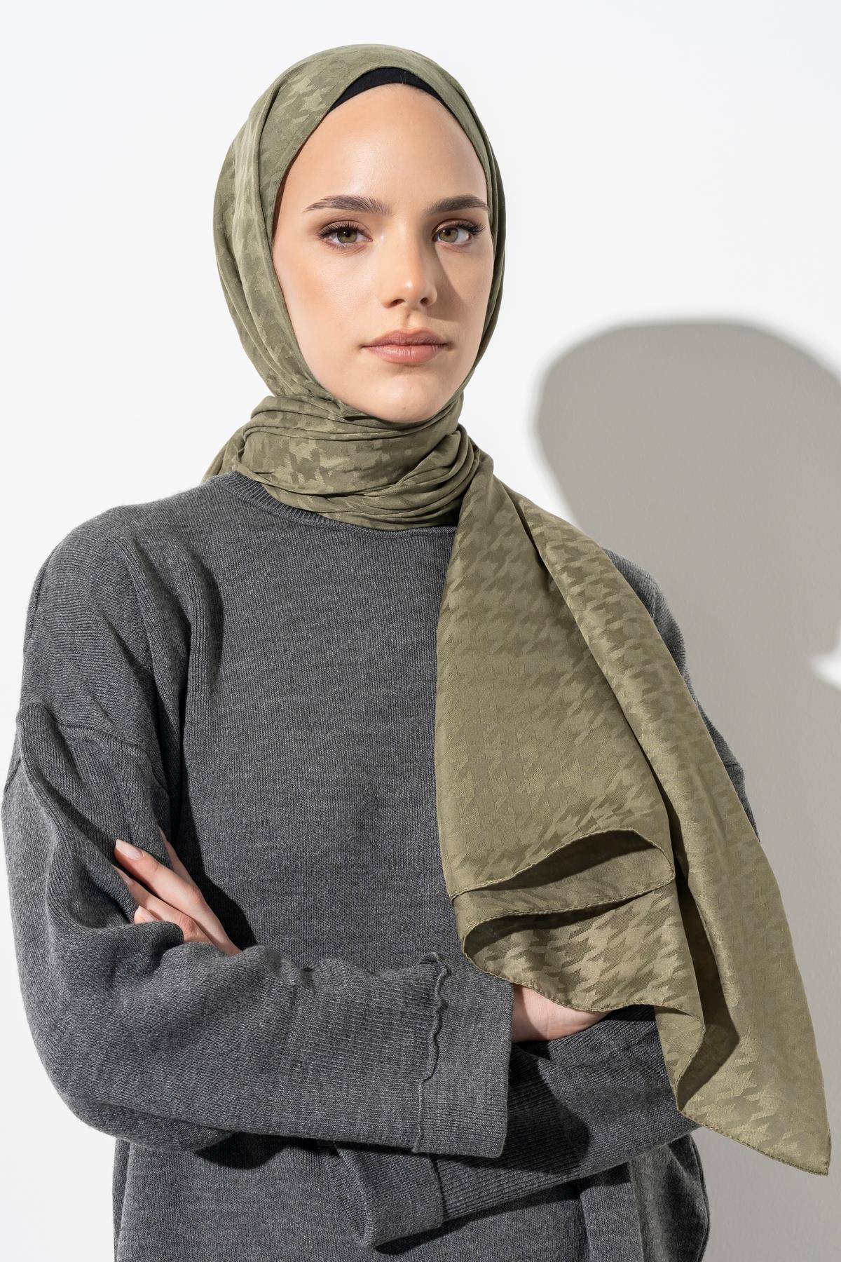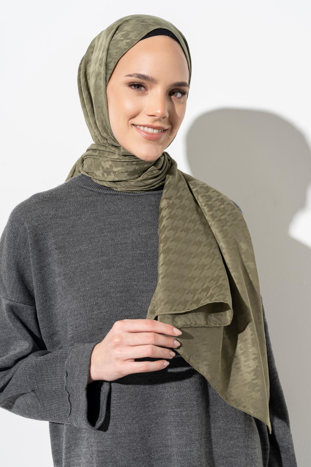 Kadın Tesettür Jakarlı Küçük Desen Kazayağı Şal KOYU HAKİ